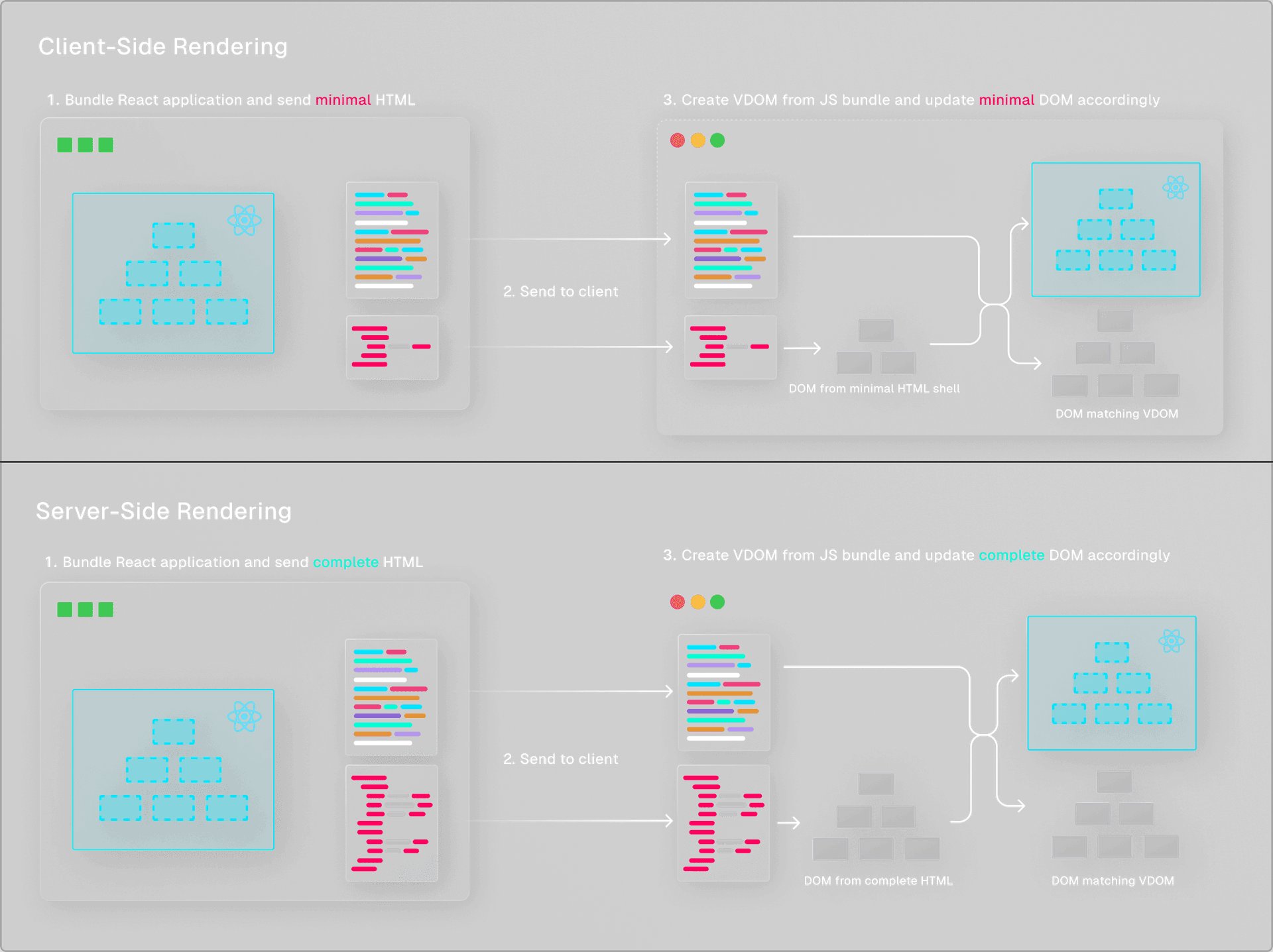 Traditionally, React offered a few primary ways to render our app. We could either render everything entirely on the client (Client-Side Rendering), or we could render the component tree to HTML on the server and send this static HTML to the client with a JavaScript bundle to hydrate the components client-side (Server-Side Rendering).