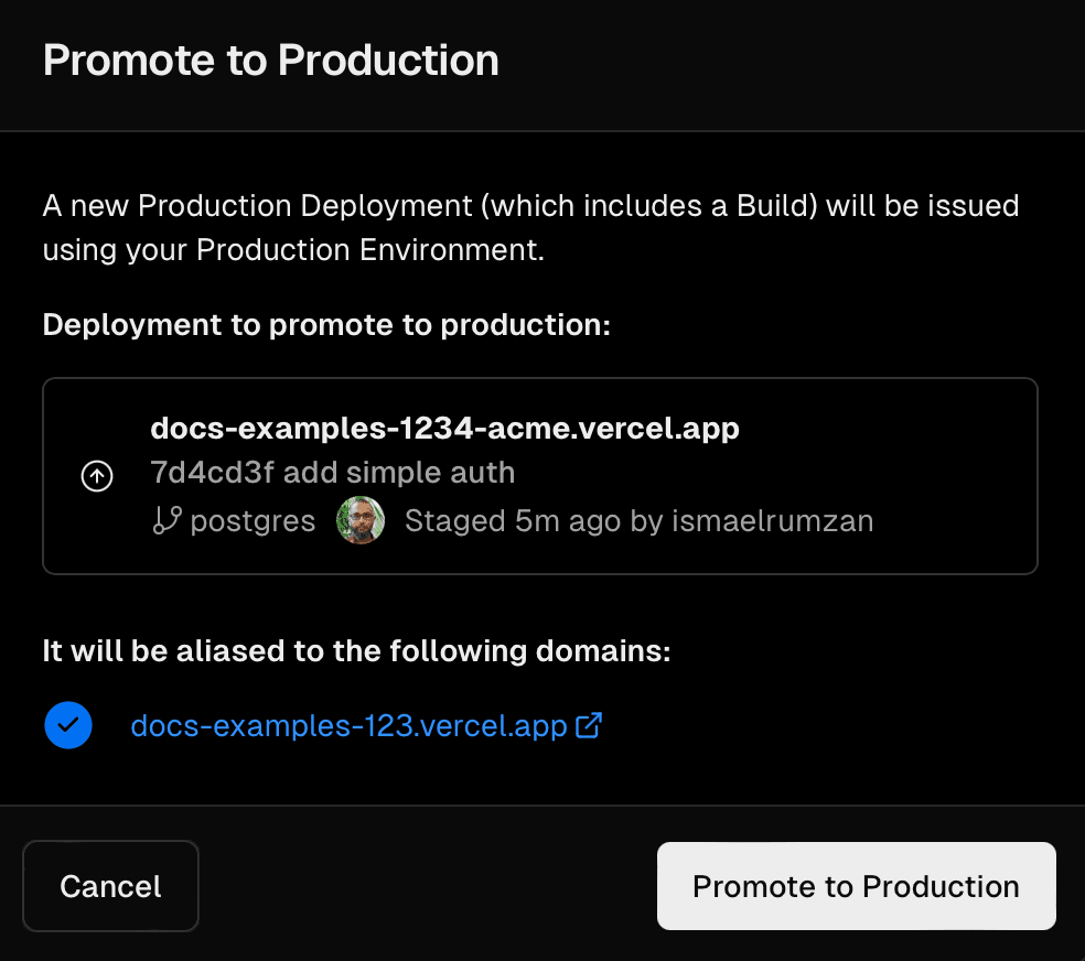 There may be times when you need to promote an existing preview deployment to production, such as when you need to temporarily use a branch that isn't set as the production branch.