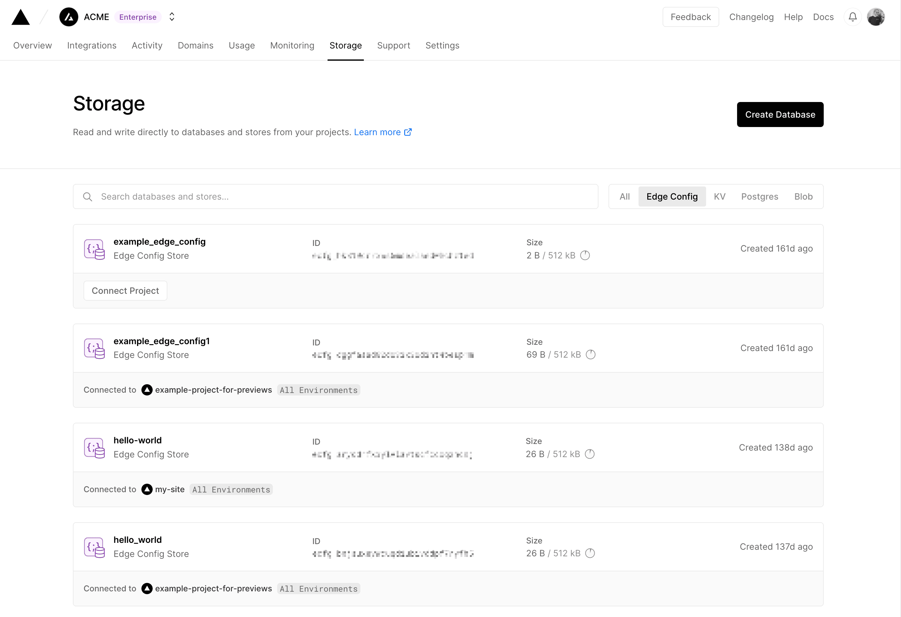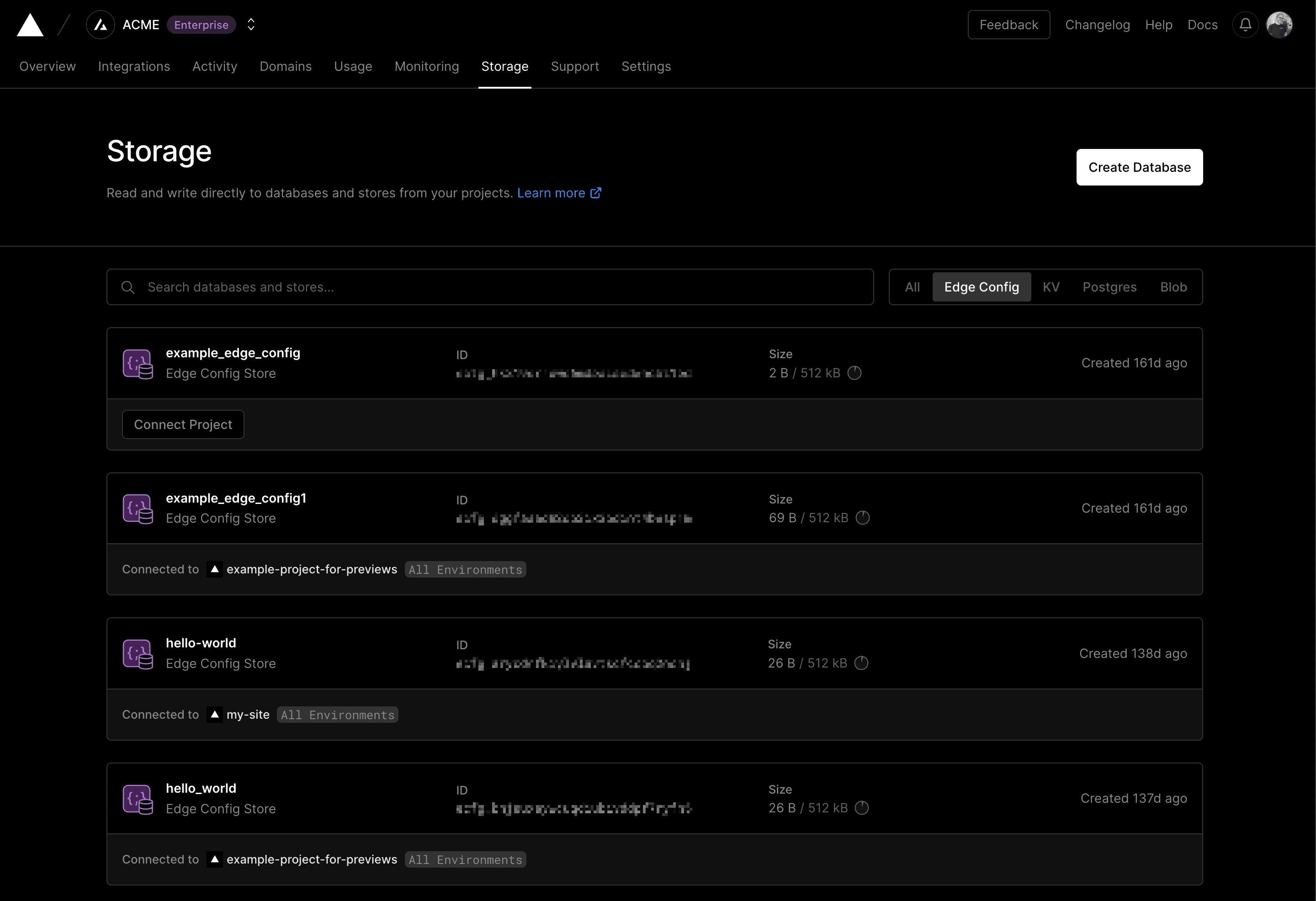 To view a list of all Edge Configs available in your account or team, go to Storage then select Edge Config from the drop-down.