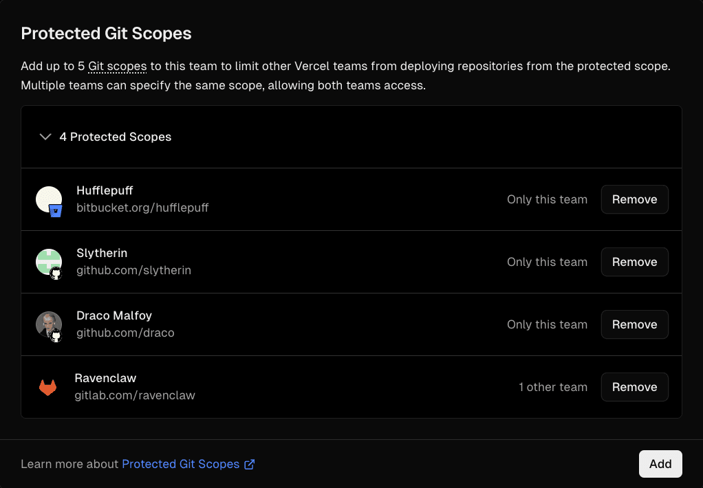 Teams often need control over who can deploy their repositories to which teams or accounts. For example, a user on your team may accidentally try to deploy your project on their personal Vercel Account. To control this, you can add a Protected Git Scope.