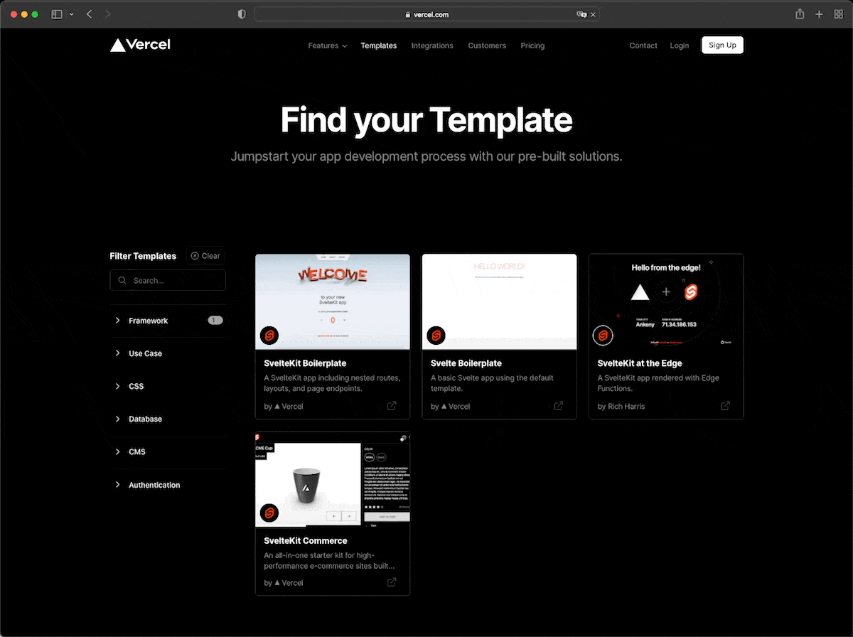 For instance, if you go to vercel.com/templates?framework=svelte, you first receive a set of skeleton loaders while the data is fetched on the client side, and then the list of Svelte templates: