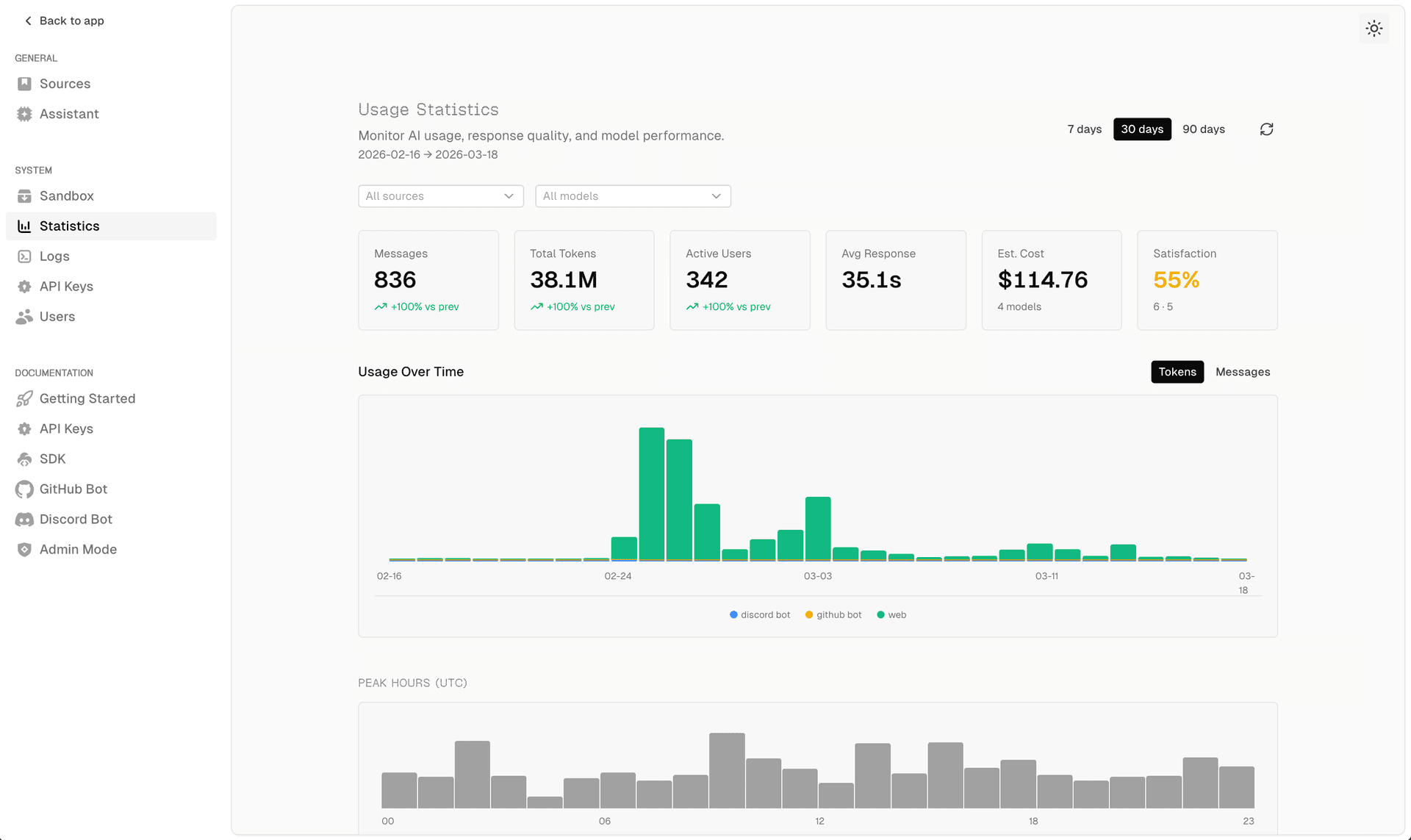 There's also an AI-powered admin agent. You can ask it questions like: "what errors occurred in the last 24 hours", or "what are the common questions users ask". It will use internal tools (query_stats, query_errors, run_sql, and chart) to provide answers directly. You debug your agent with an agent.
