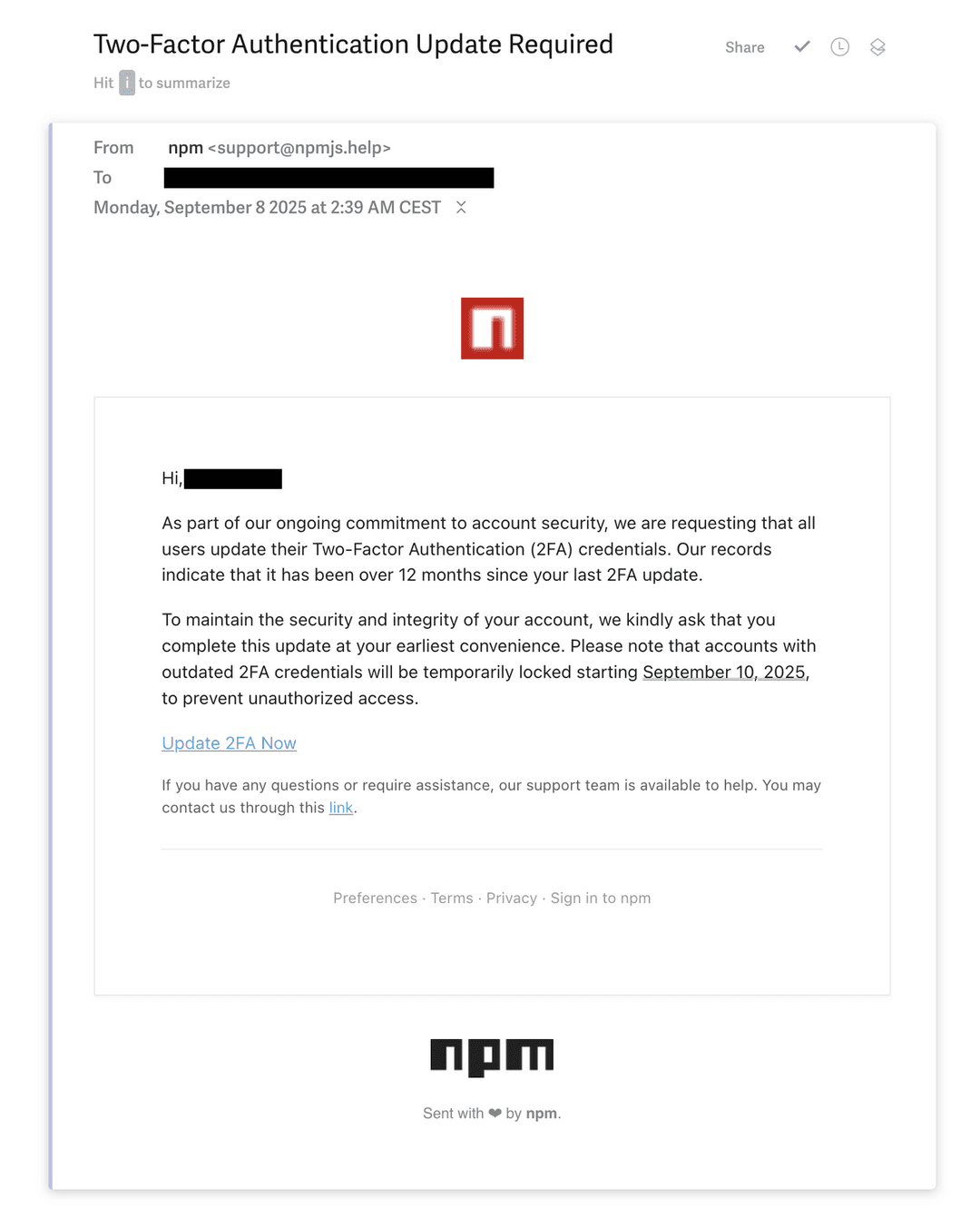 The attack originated from a phishing campaign targeting npm package maintainers. The attacker used the domain npmjs.help (now taken down) to harvest credentials through a convincing two-factor authentication update email: