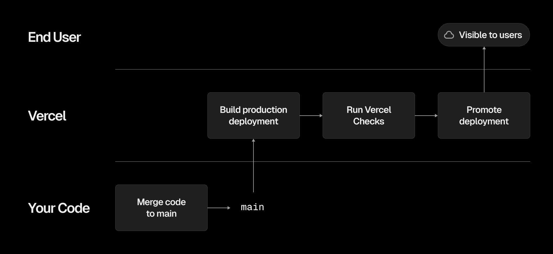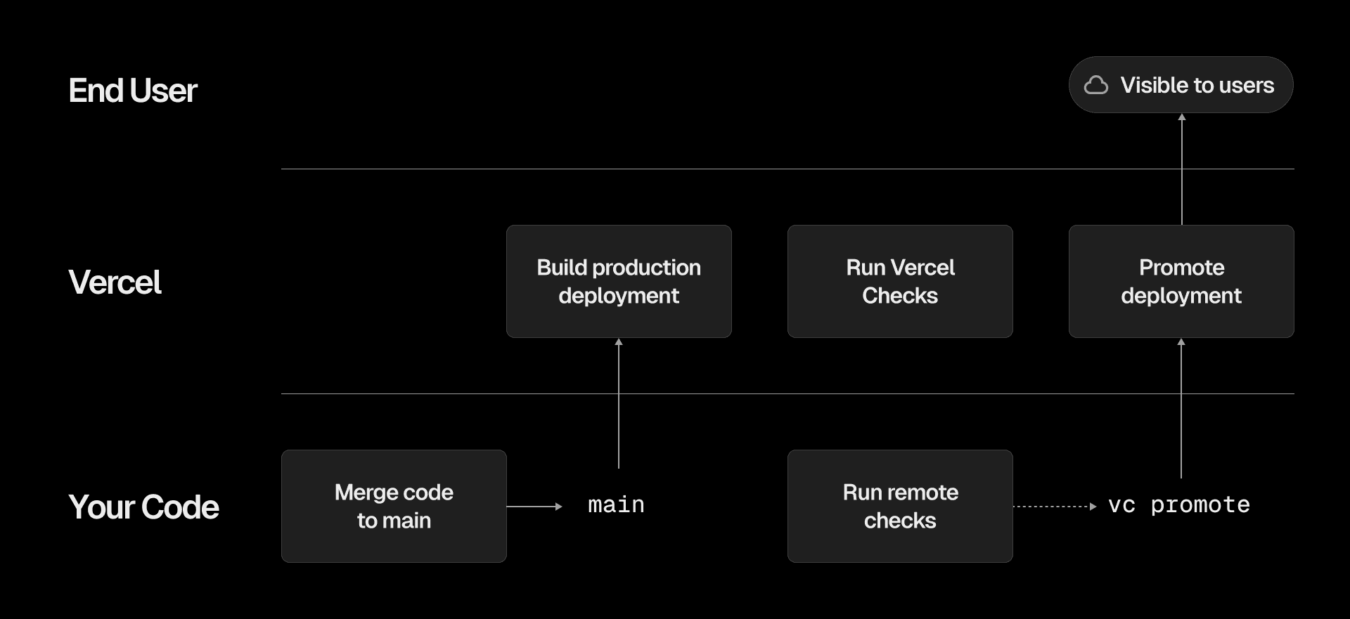 This change allows workflows to introduce additional steps between when a production build is complete before end users see the changes while still benefitting from Vercel’s automatic deployment. For example, you can run additional CI checks on the production deployment and automatically promote after those checks complete.