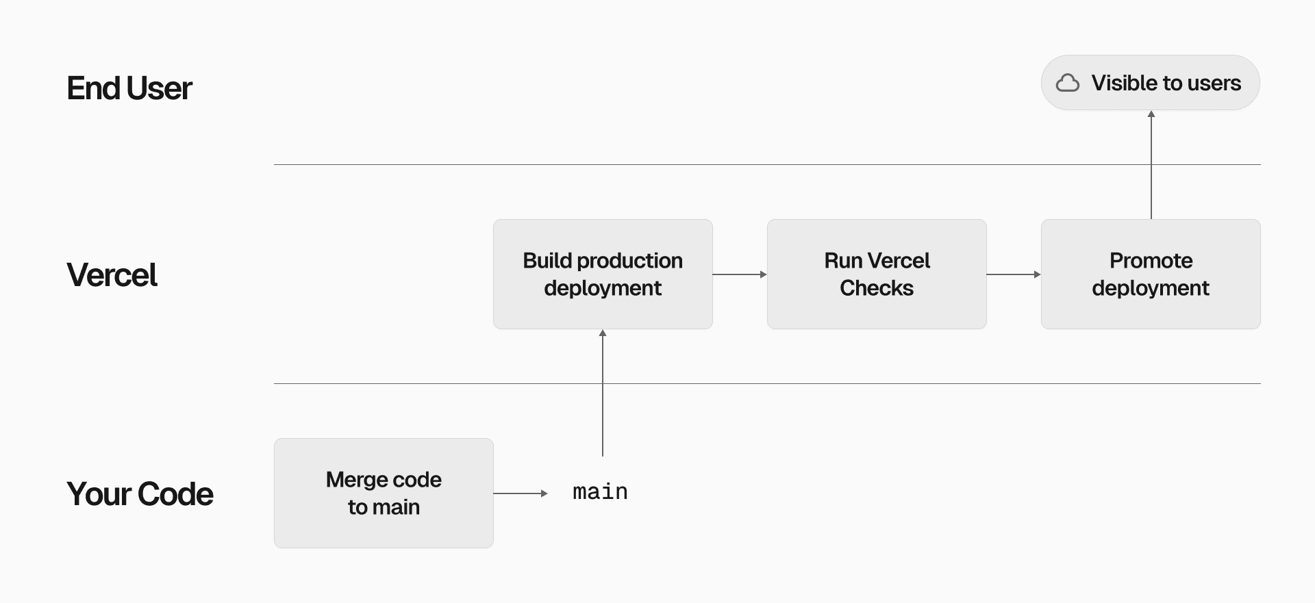 By using Vercel, you can remove slowdowns merging code in your repository and improve the time from pull request to landing that change in production. Additionally, it enables you to run additional checks after a deployment completes before users visit that deployment without having to create a complex workflow—helping you iterate faster while maintaining production quality.