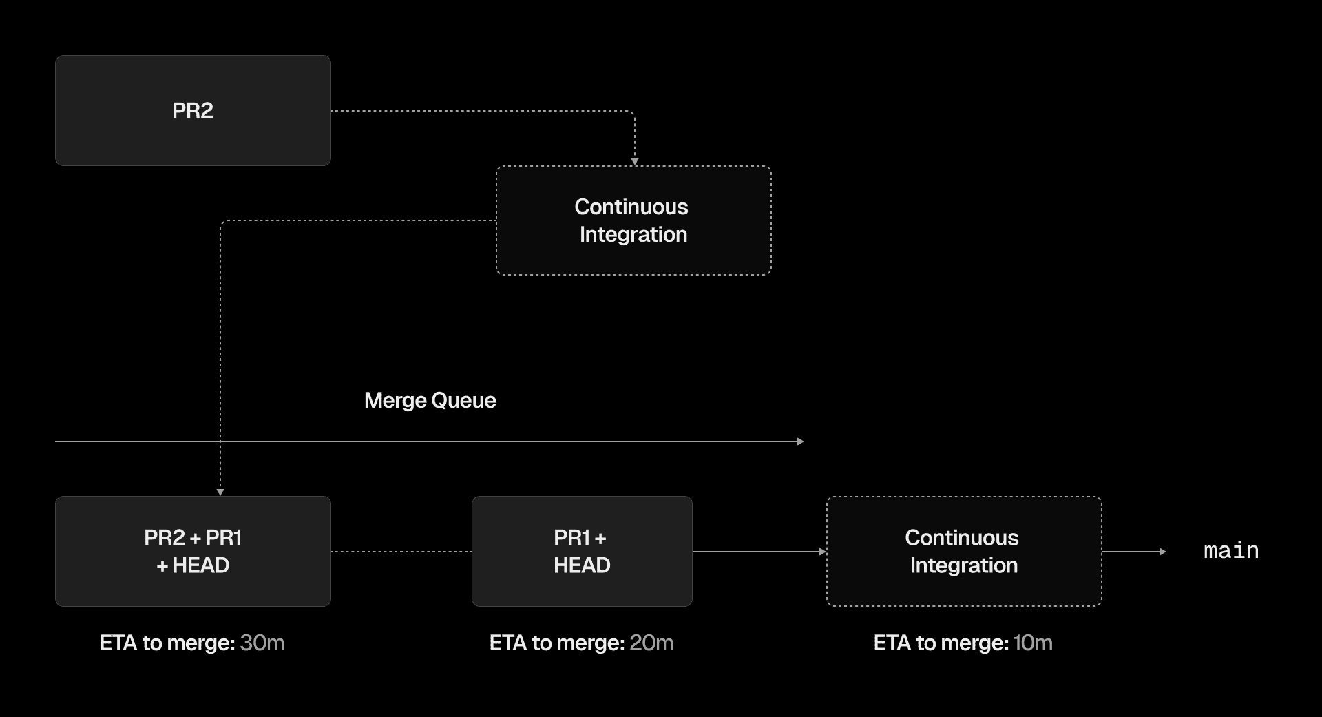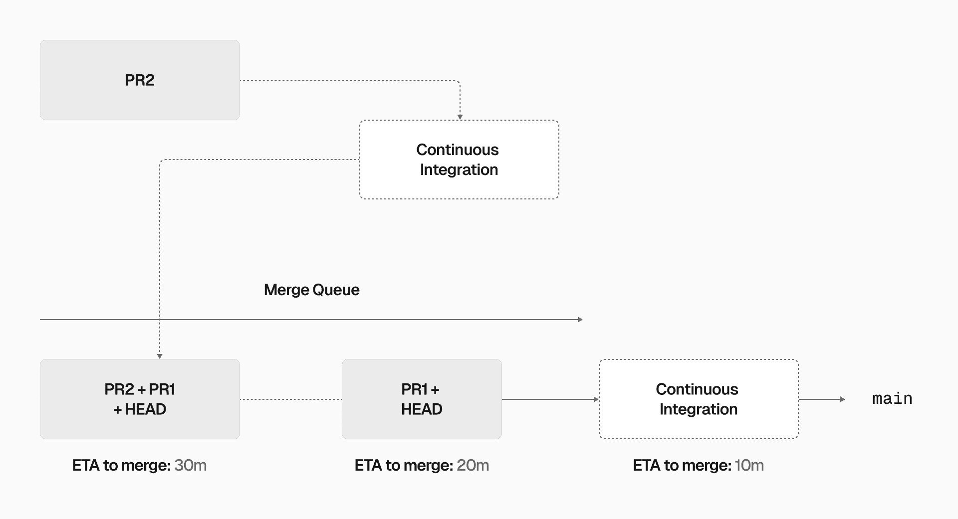 before merge, developers may have to update branch multiple times before they can merge their code, unnecessarily performing a lot of the same checks over again. A merge queue is an alternative solution to alleviate this pain, but this can also slow down productivity by forcing commits from each developer to be tested before merge in serial, even from unrelated commits.