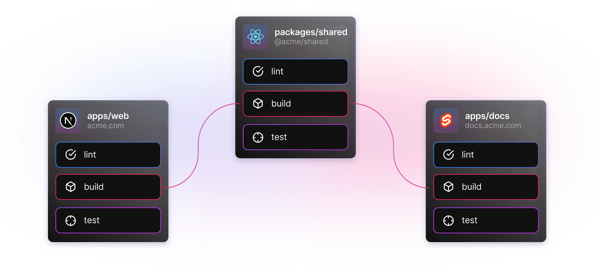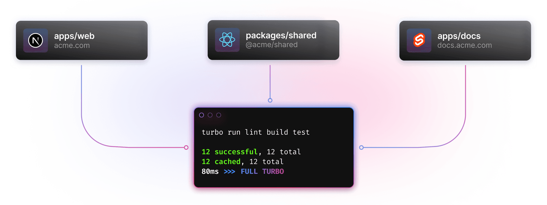 The first big piece that we added to our run outline was the package graph. The package graph is a graph data structure of all the packages in your Turborepo, where the graph’s nodes are your packages and the edges are the dependency relationships between them. This allows us to deeply understand your monorepo and cache work so you never do it twice.