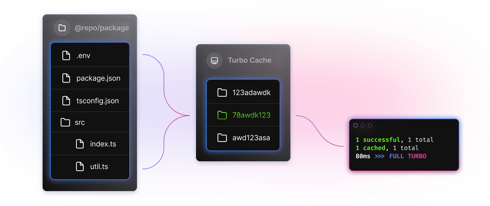 When it comes time to run a task, we first produce this task hash, and check if it’s in either the filesystem or the Remote Cache. If it is, we restore the task’s outputs in milliseconds. Otherwise, we run the task and store the outputs in the cache for next time.