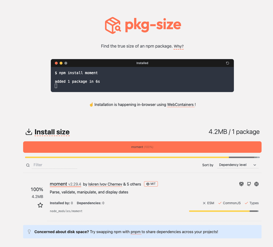 Tools such as pkg-size can be used to determine the size impact of NPM packages based on what’s imported from them and help decide between alternatives.