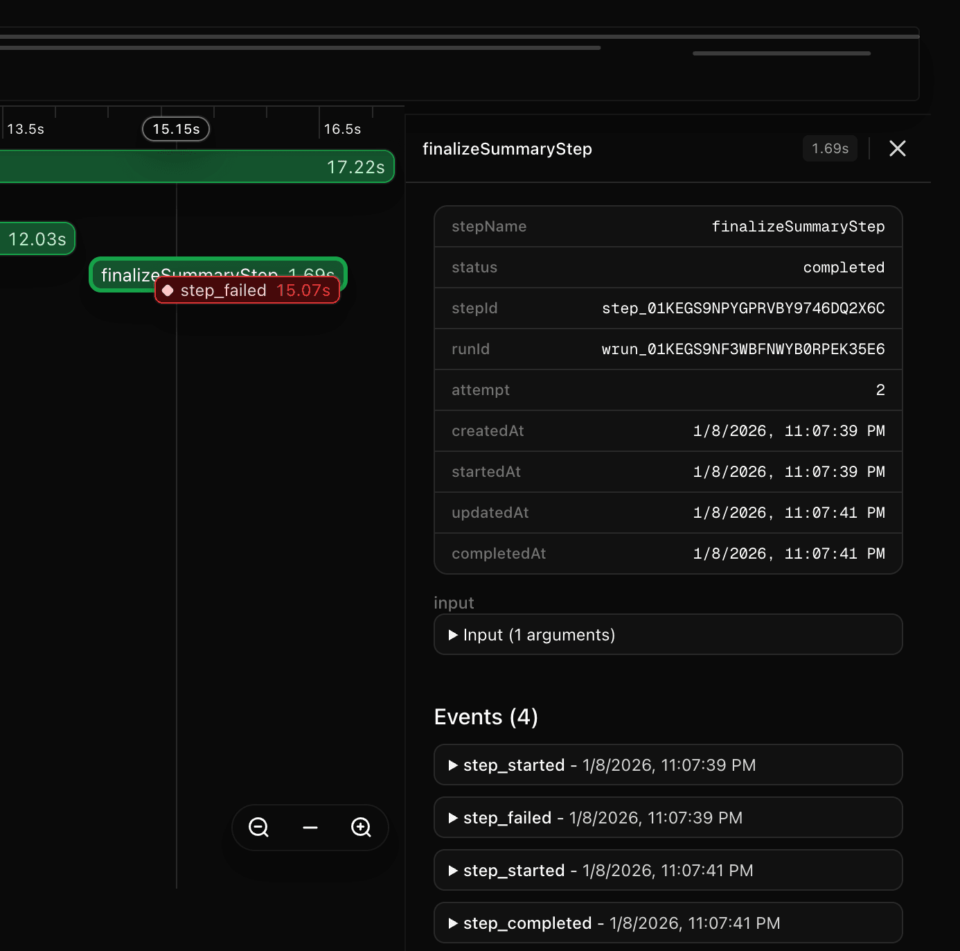 return { summaryResp, moderationResp, emailResp };}Here's what it looks like in the observability dashboard when a step fails on the first run, then gets retried 2 seconds later and succeeds: