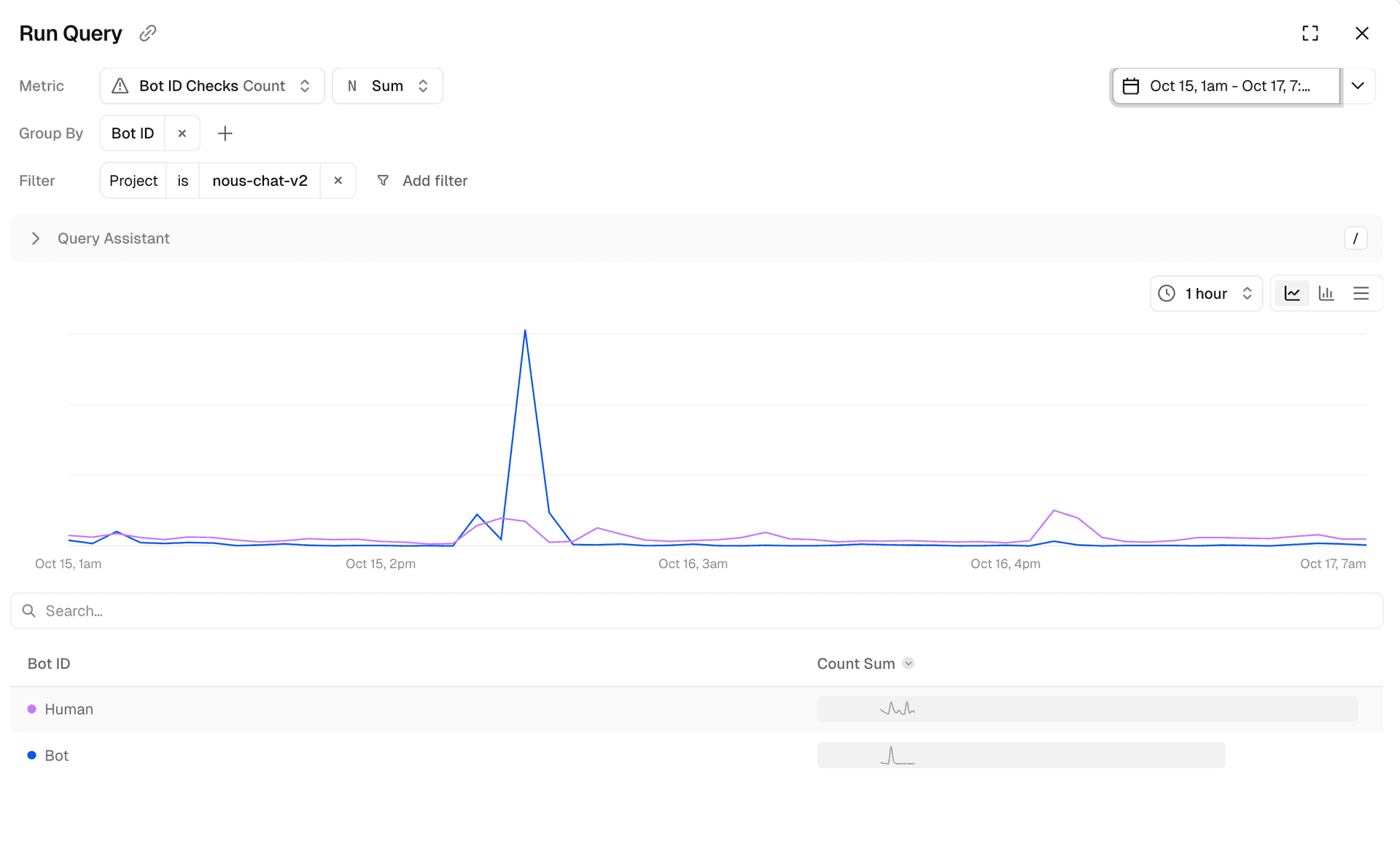 By deploying Vercel BotID at multiple points in its user flow, Nous Research prevented large-scale automated abuse before it could impact infrastructure, reduced wasted inference costs, and maintained app availability for its free tier without compromising security or user experience. And because BotID responded automatically, Nous did not have to spend valuable time or resources triaging traffic issues. Now they can continue their mission to host a free, open-source LLM for users around the world safely.