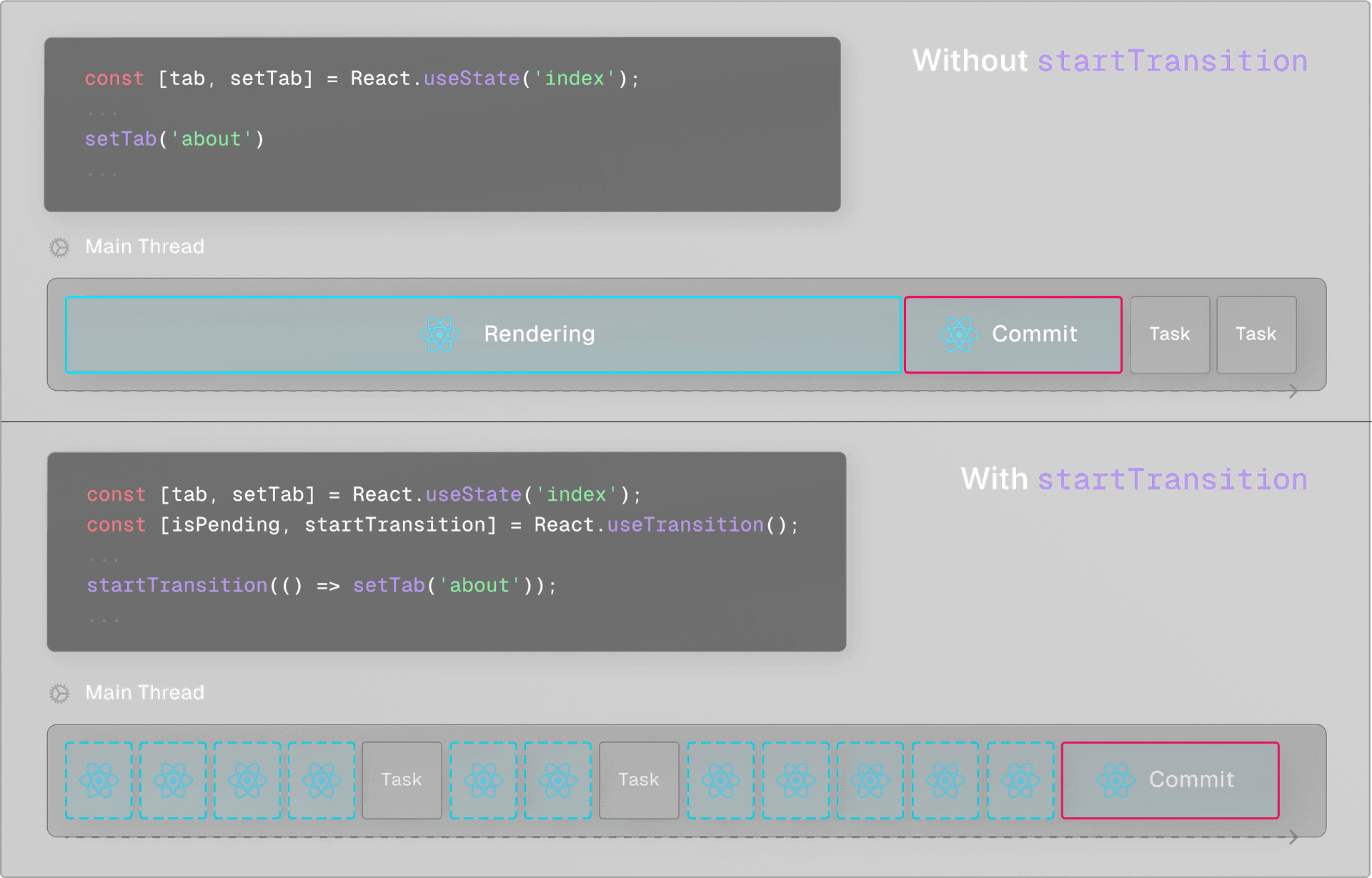 return ( <button onClick={() => { urgentUpdate(); startTransition(() => { nonUrgentUpdate() }) }} >...</button> )}