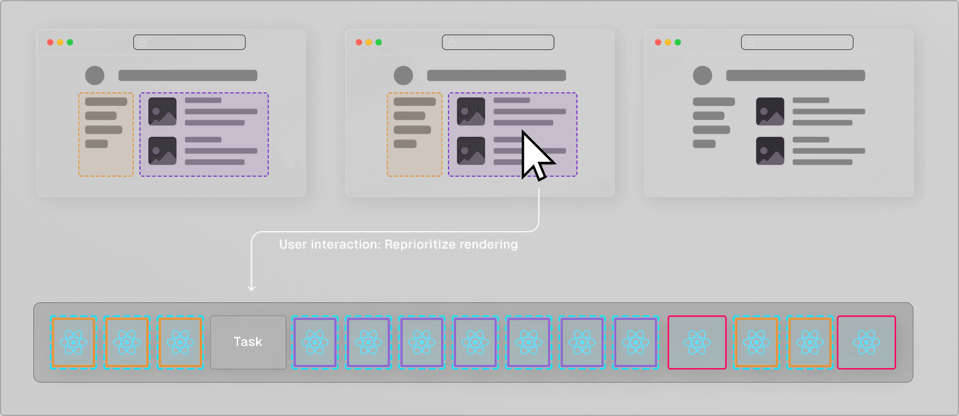 React can also reprioritize components based on user interaction. For example, when a user interacts with a suspended component that's not currently being rendered, React suspends the ongoing render and prioritizes the component that the user is interacting with.