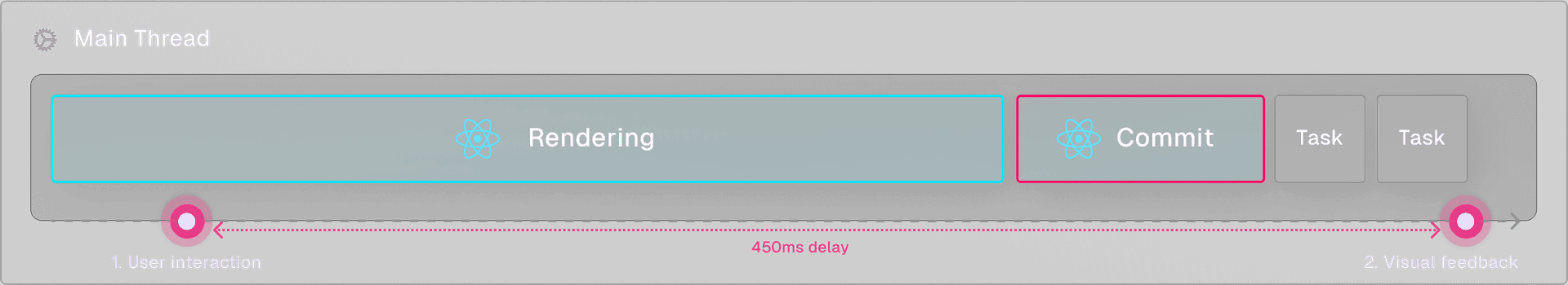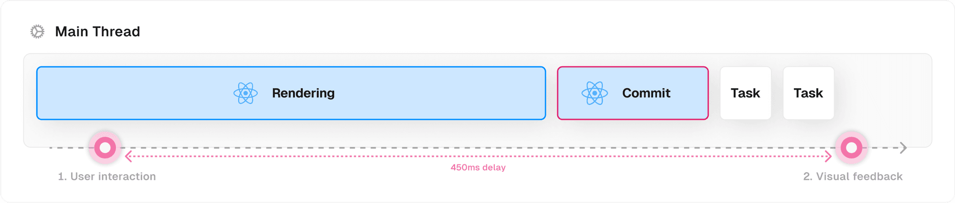 A synchronous render is an “all-or-nothing” operation, where it’s guaranteed that a component that starts rendering will always finish. Depending on the complexity of the components, the render phase could take a while to complete. The main thread is blocked during this time, meaning that users trying to interact with the application experience an unresponsive UI until React has completed the render and committed the result to the DOM.