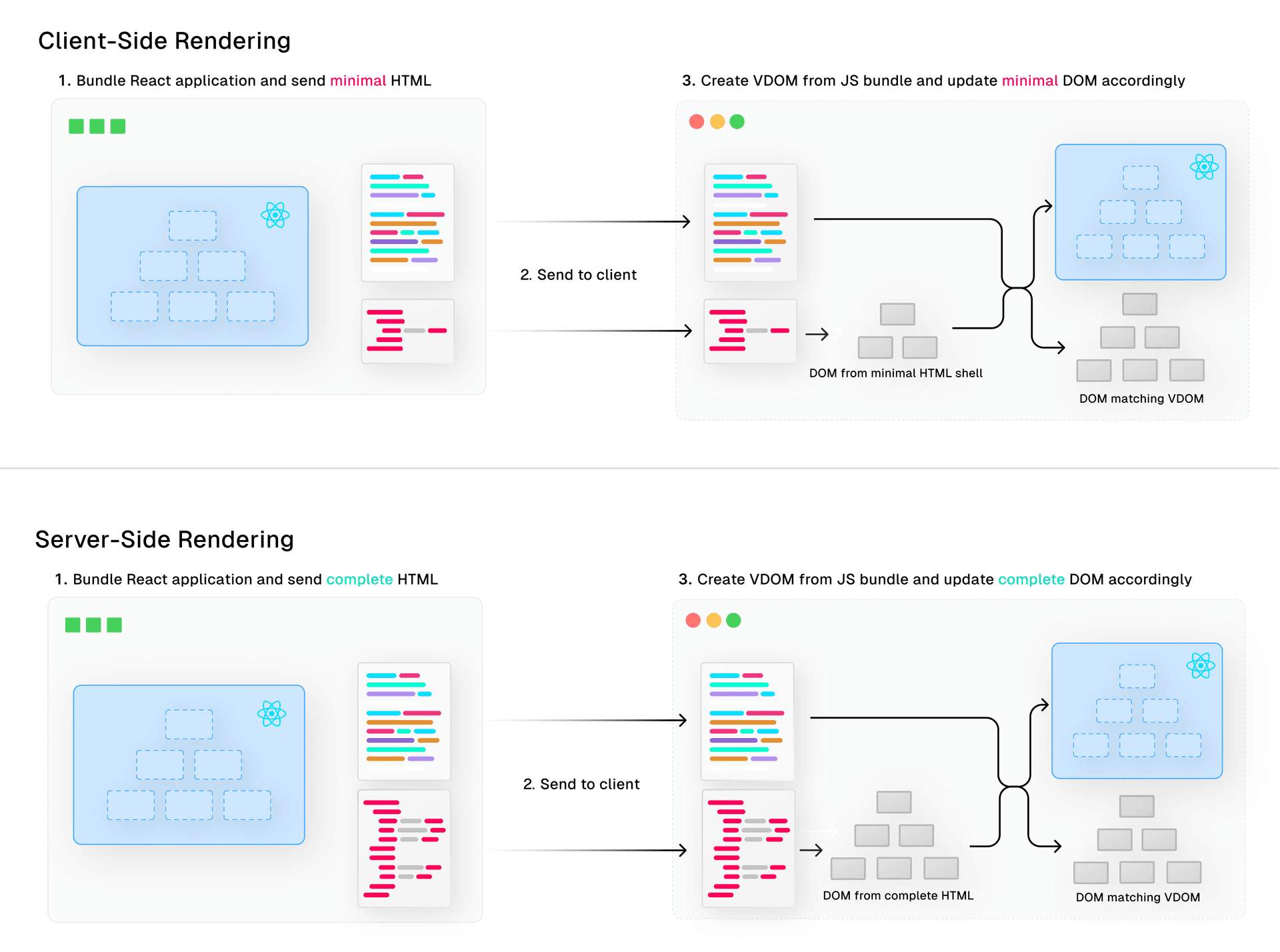 Both approaches rely on the fact that the synchronous React renderer needs to rebuild the component tree client-side which the use of the shipped JavaScript bundle, even though this component tree was already available on the server.