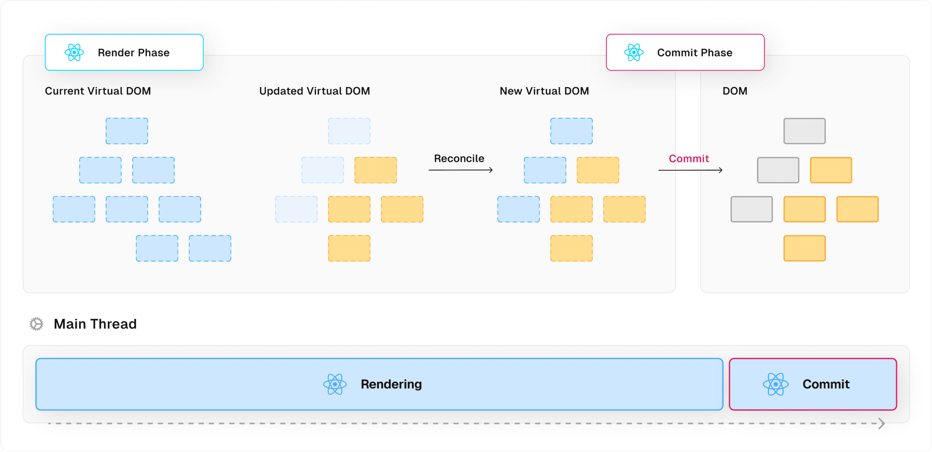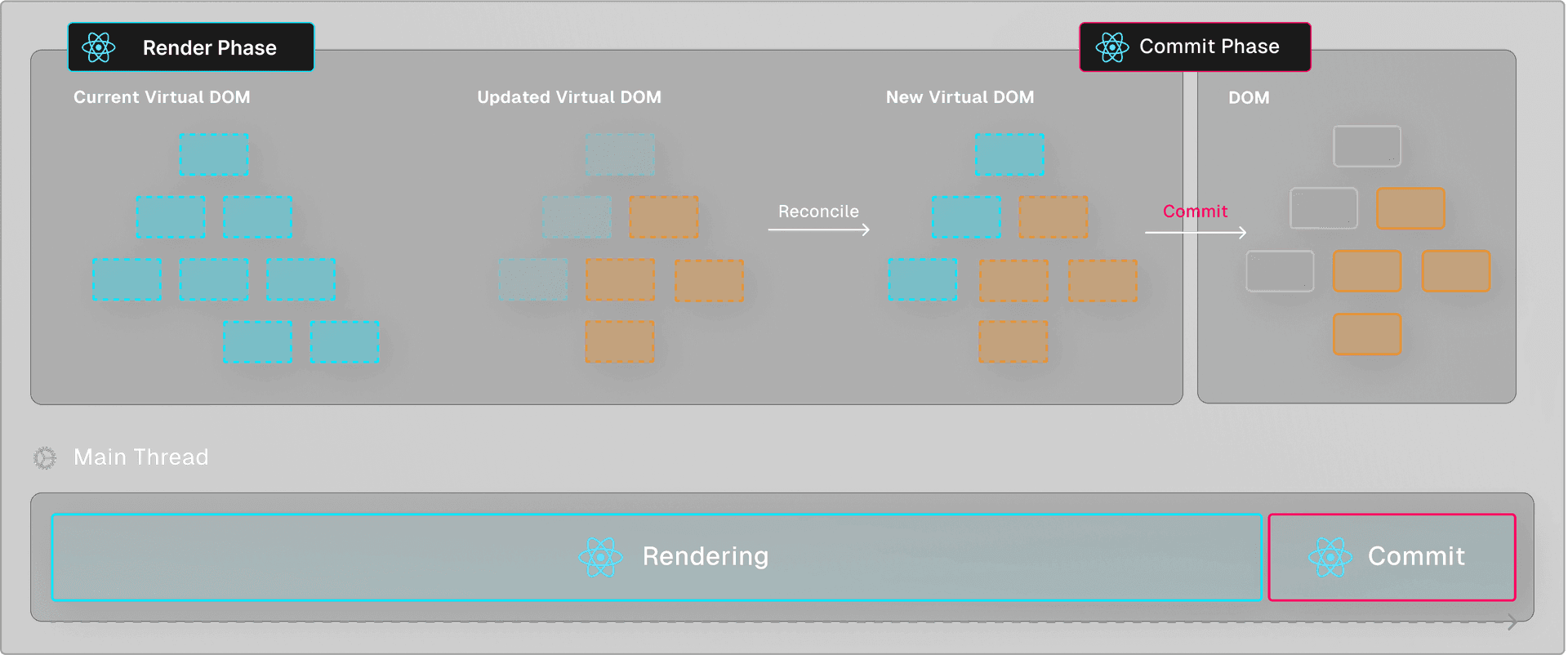 A visual update in React is divided into two phases: the render phase and the commit phase.