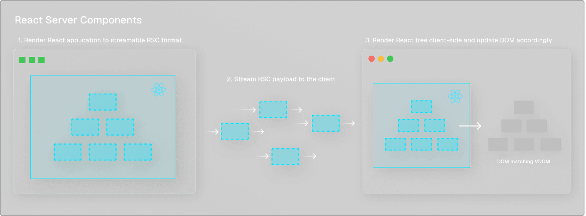 with React Server Component’s streamable format allows high-priority updates to be sent to the client as soon as they're ready, without waiting for lower-priority rendering tasks to complete. This enables the client to start processing data sooner and provides a more fluid user experience by gradually revealing content as it arrives in a non-blocking manner.