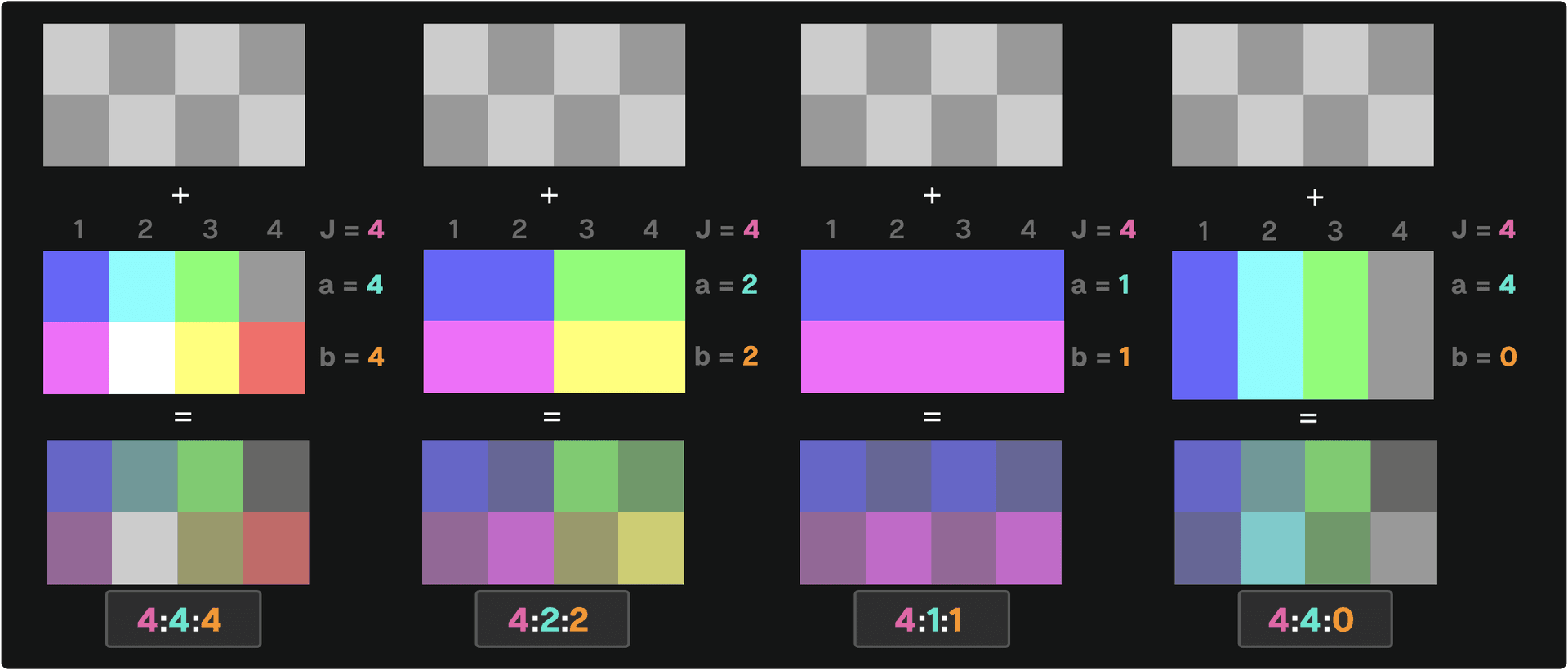 4:4:4: No subsampling. Each pixel has its dedicated luminance (Y) and chrominance (Cr, Cb) values. It has the highest fidelity in color representation, but also the largest data size.4:2:2: For every 4 pixels, the luminance (Y) data is fully preserved, but the chrominance (Cr, Cb) data is averaged for 2 pixels and discarded for the other 2. This reduces file size with a moderate loss in quality.4:1:1: For every 4 pixels, luminance (Y) data is retained, but chrominance (Cr, Cb) data is averaged for 1 pixel and discarded for the other 3. This offers more compression than4:2:2but with a greater loss in color detail.4:4:0: For every 4 pixels in a horizontal line, the luminance (Y) data is individually preserved for each, ensuring full brightness detail. Chrominance (Cr, Cb) data is averaged for 2 pixels and then shared between those 2 pixels on a single row, discarding any chrominance information vertically. This results in color detail being preserved horizontally, but a loss of color fidelity vertically.
