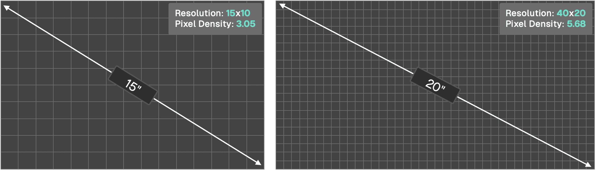 Resolution is the total count of pixels in an image's width and height. Devices with high pixel densities, e.g. Retina displays, may require images with higher resolutions to appear crisp. However, larger resolutions come at the cost of larger file sizes.