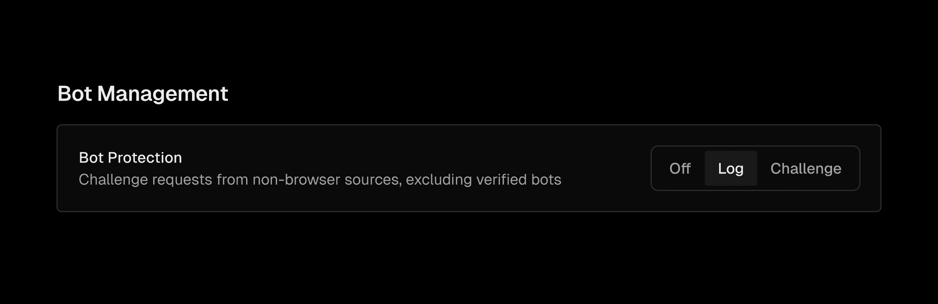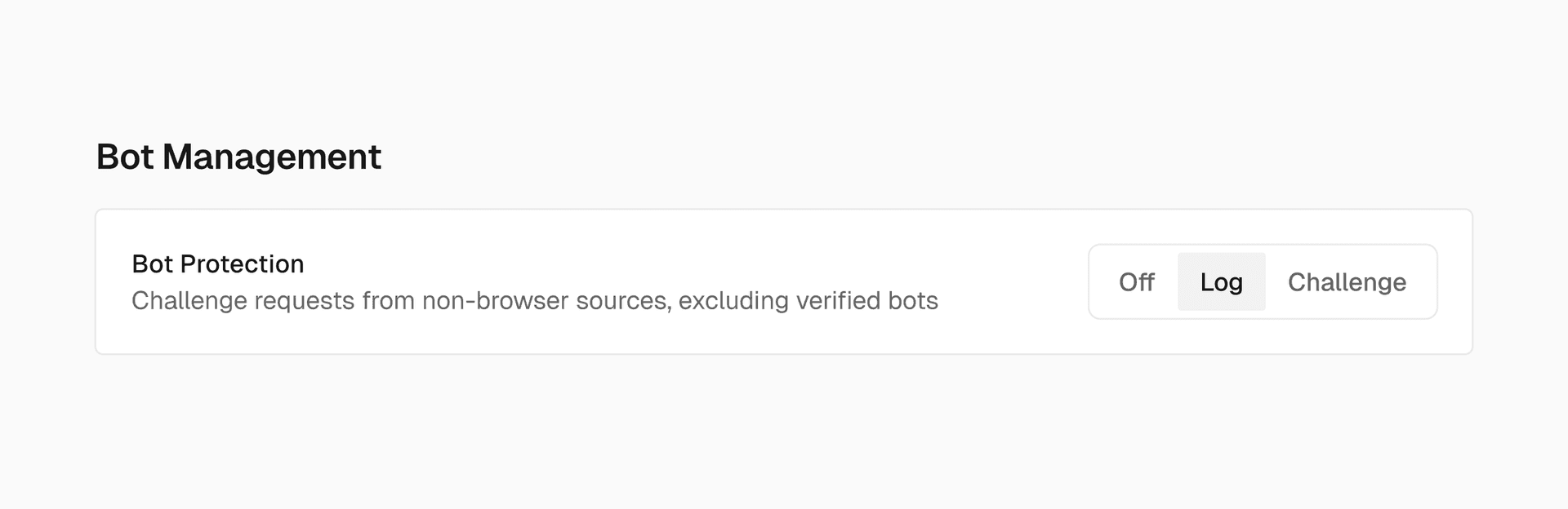 We recommend you enable Bot Protection in Log-Only Mode first to gain visibility into your app's traffic and bot sources by showing what requests would be challenged. For legitimate automated traffic not covered by verified bots list, you can use custom WAF rules with the bypass action to ensure that this traffic reaches your app.