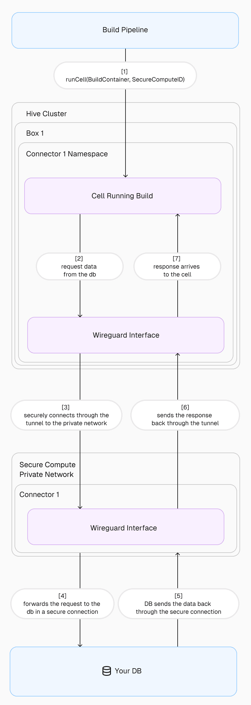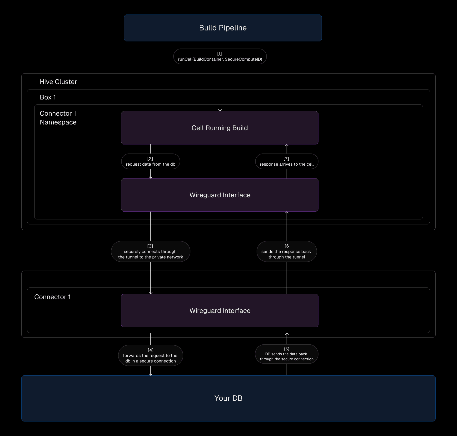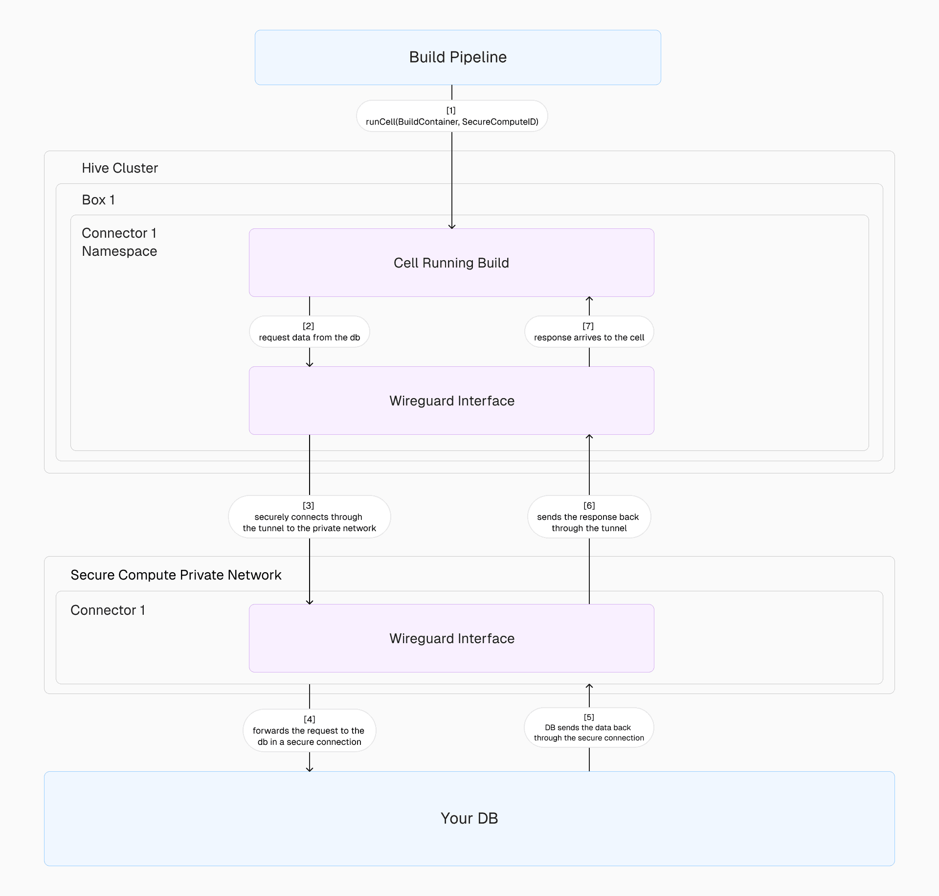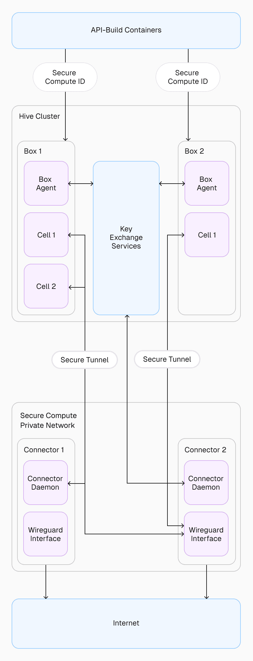 When a cell in a Hive box initiates a network call, the traffic is encrypted by a WireGuard interface configured with a unique private IP for the box. The traffic flows through the appropriate connector in the Secure Compute network, where it’s decrypted and routed to its destination.