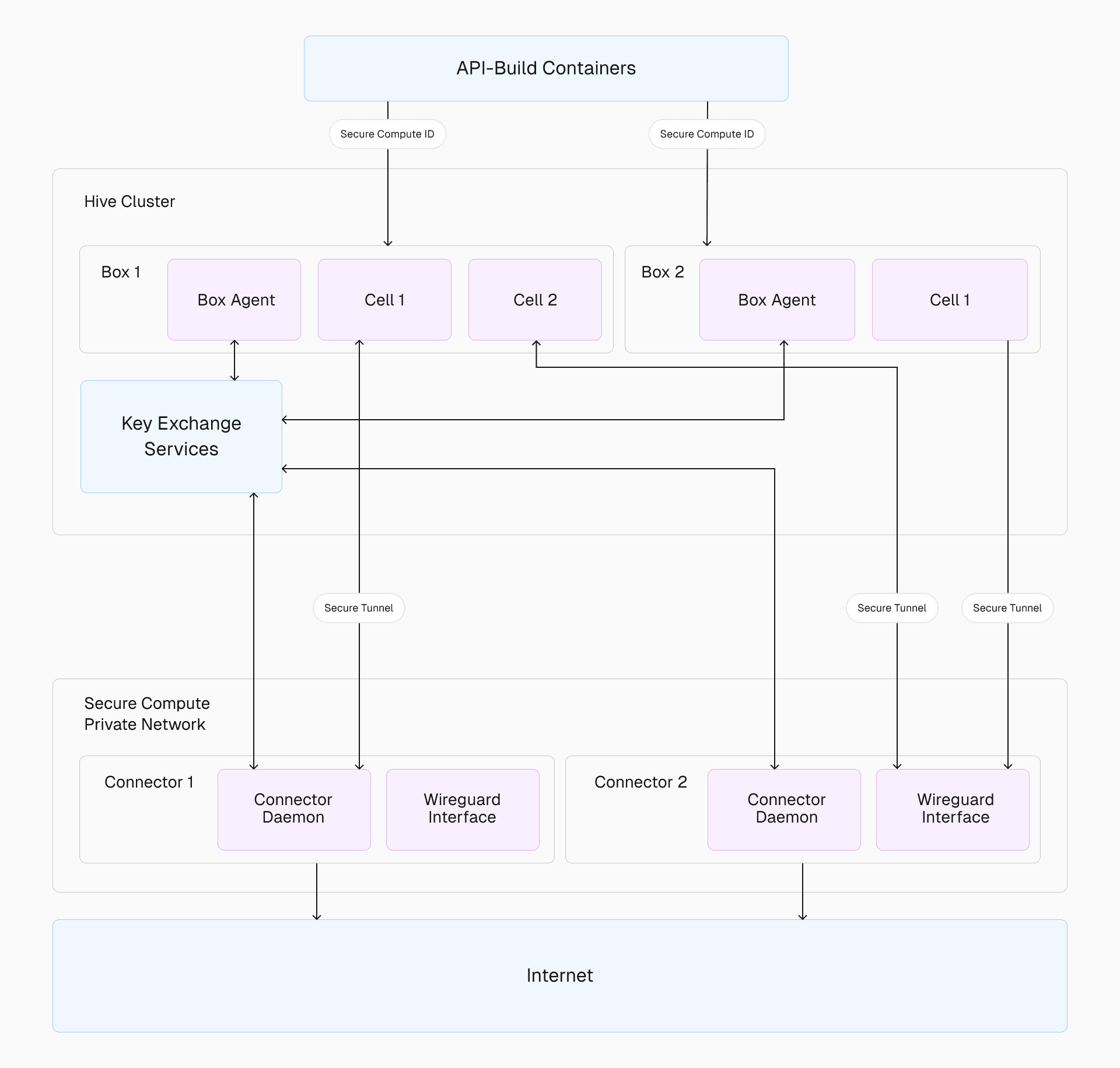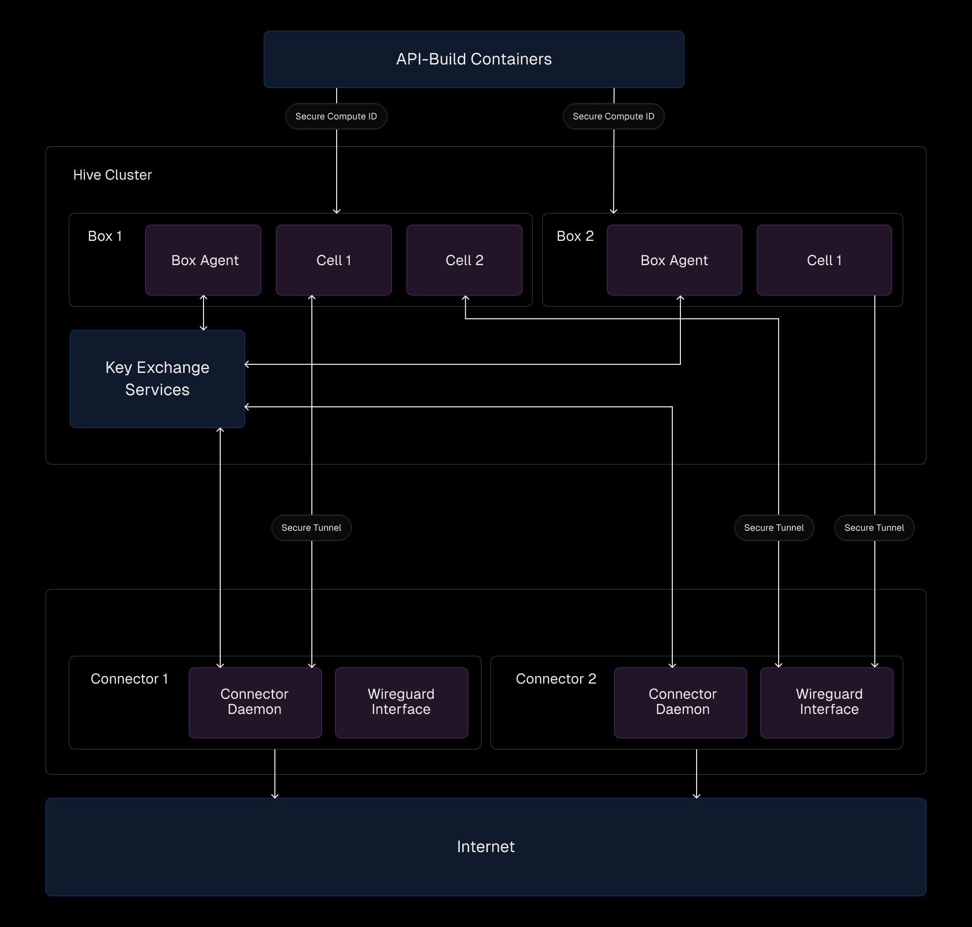EC2 instances running inside the Secure Compute network that terminate WireGuard® connections and securely route network traffic. These connectors behave as if they were part of the Hive network, enabling seamless communication. Each connector runs a daemon that interfaces with the Key Exchange Service to manage key distribution and routing information. Additionally, a WireGuard interface on each connector is responsible for creating secure tunnels with each Hive cell.