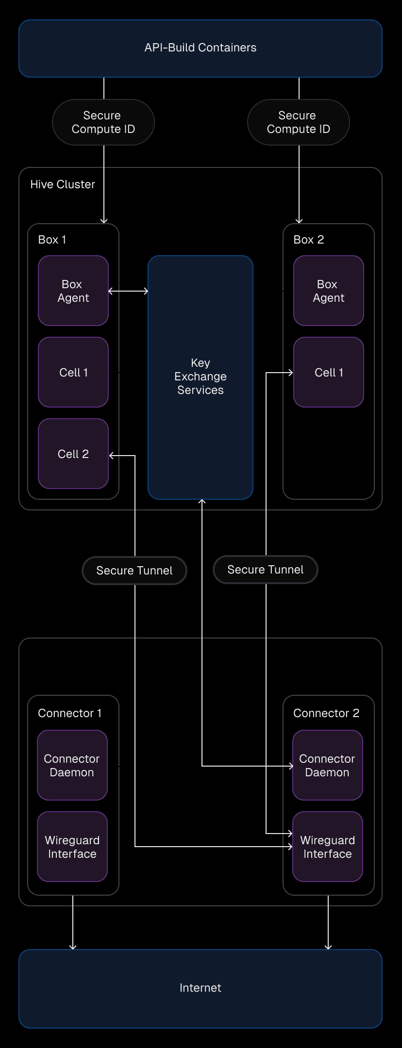 Each Hive cell initiates a secure tunnel with the connector’s WireGuard interface. Keys are generated at instance boot and distributed via the Key Exchange Service, with no persistence or reuse. They are automatically removed when instances shut down, maintaining a secure lifecycle.