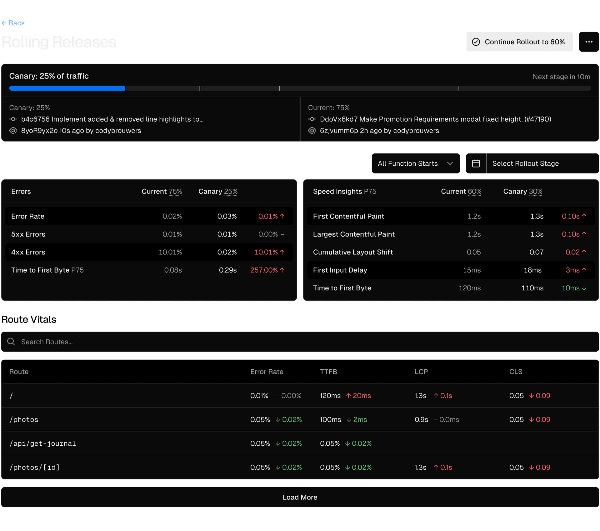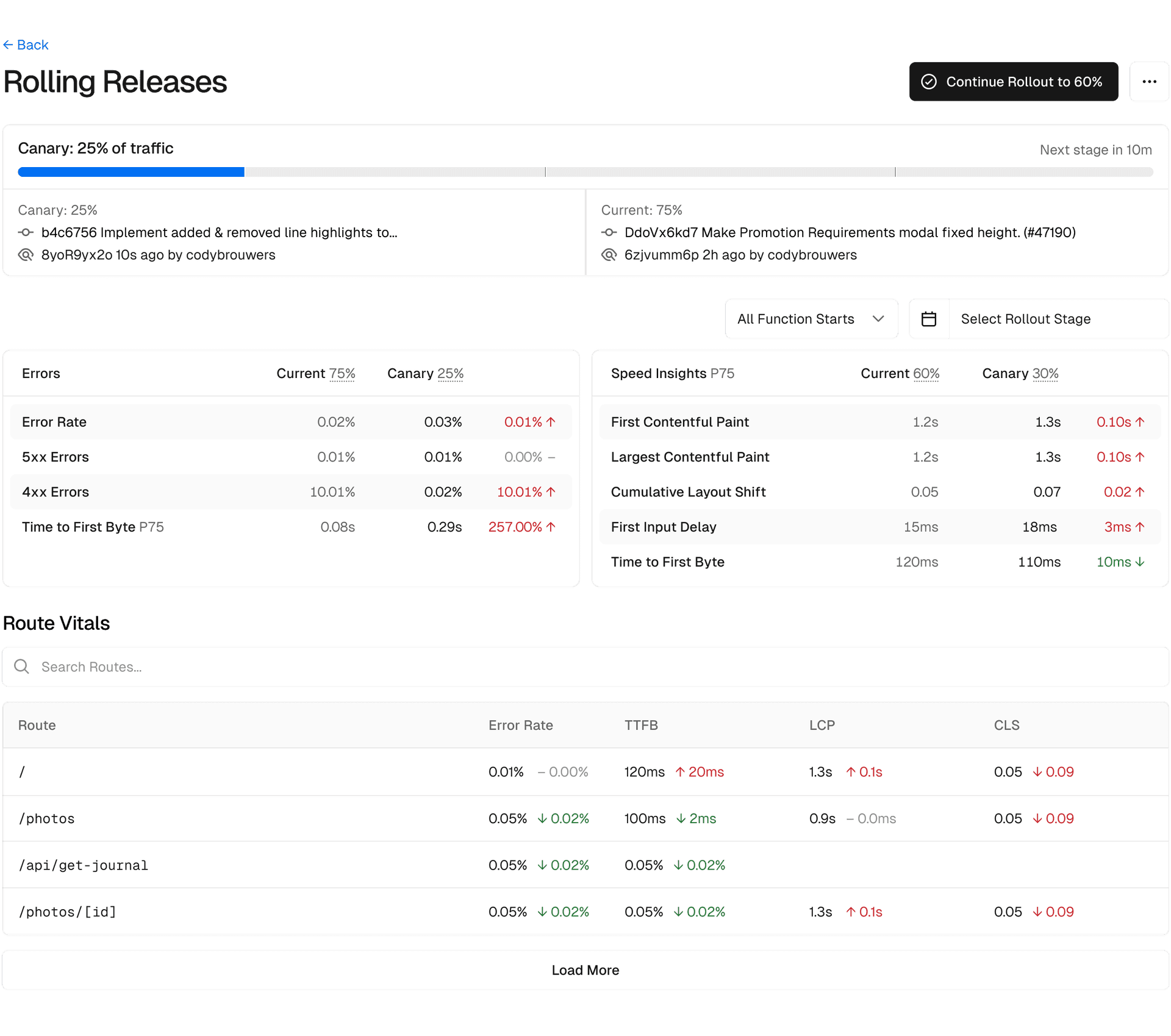 Rolling Releases is a Vercel feature for creating exactly this sort of release safety. In just a few clicks, you can set up multi-stage deployments that advance automatically or manually. Additionally, you can use data from Vercel Observability or external sources to verify the new deployment's acceptability.