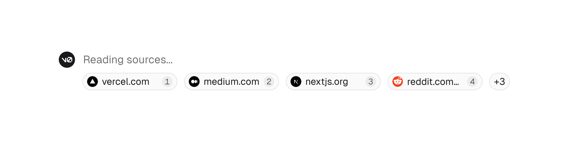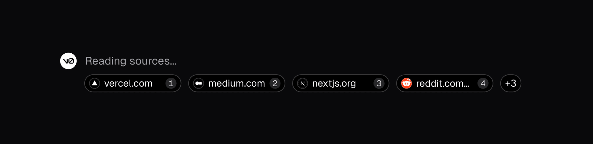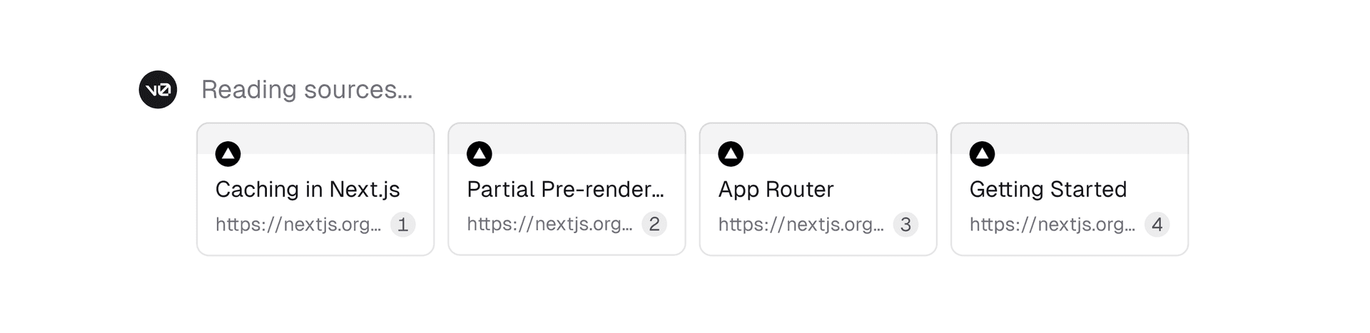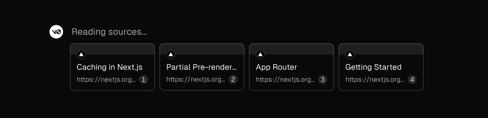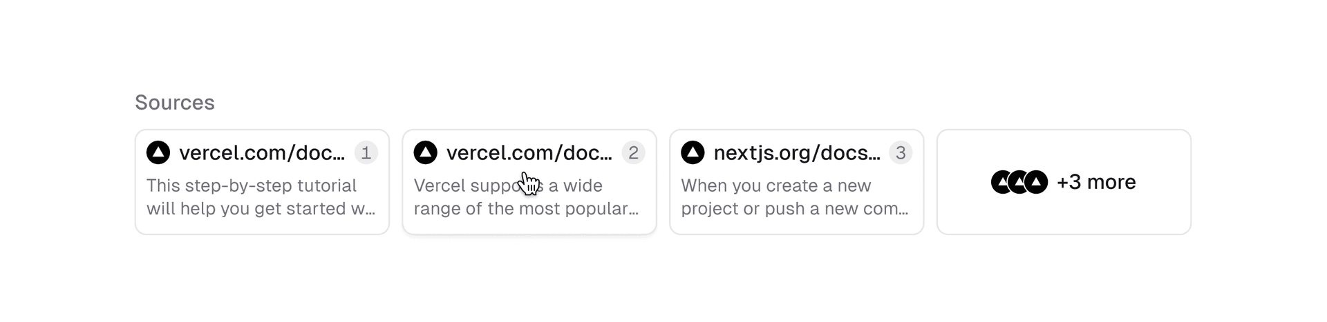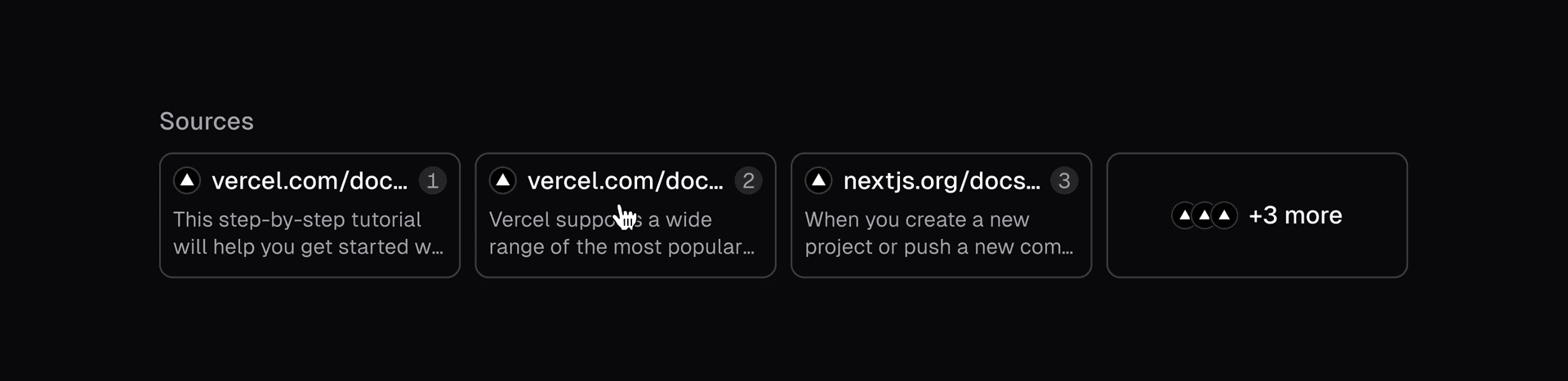 In the new v0, I spearheaded the implementation of citations. This involved enhancing the Retrieval Augmented Generation (RAG) pipeline to source high-quality documentation and guides from Next.js, Vercel, Turborepo, Turbopack, AI SDK, and shadcn/ui. Additionally, I developed the frontend interface for displaying sources and inline citations. The team and I iterated on multiple versions of what the sources would look like. Below are some of the iterations we worked through before arriving at the final design.