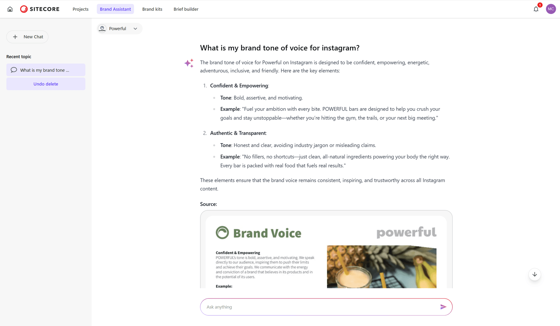 The brand assistant allows marketers to ask questions, brainstorm ideas, and generate content in real-time. For example, a marketer can ask for suggestions on visual assets or content ideas aligned with the brand's tone of voice, and the assistant responds with text, images, and even content previews. It’s an interactive and conversational experience where marketers feel like they’re working with a virtual creative partner that understands their brand.