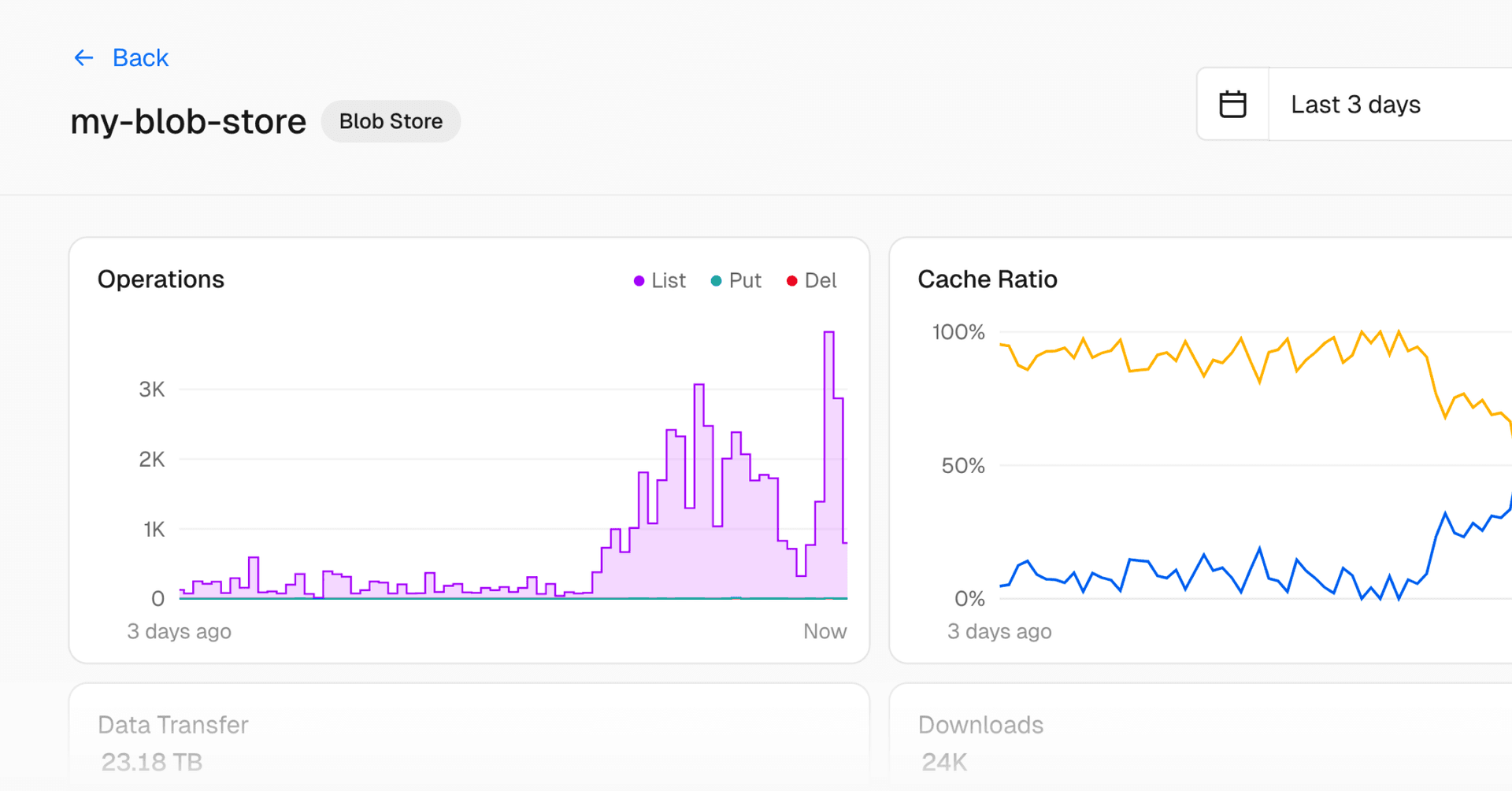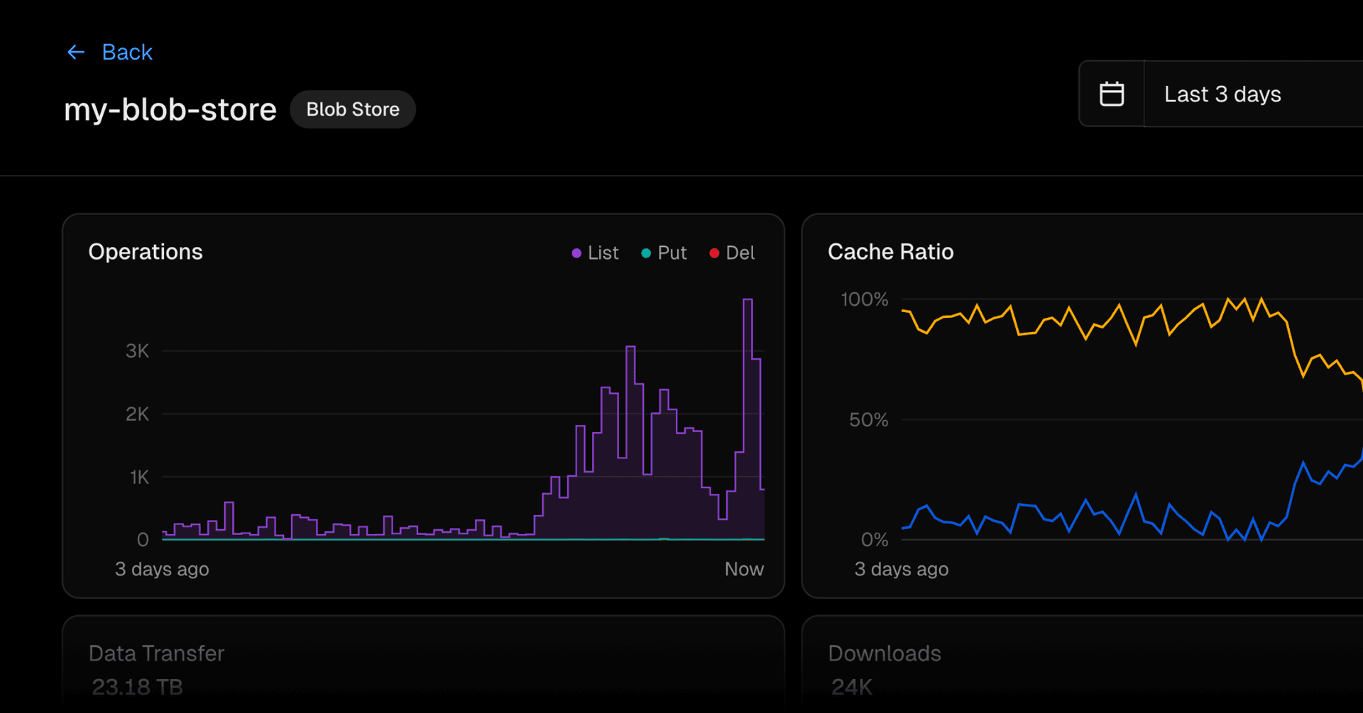 That's why we built Vercel Blob: Amazon S3-backed storage that's deeply integrated with Vercel's global application delivery and automated caching, with predictable pricing to serve public assets cost-efficiently at scale.
