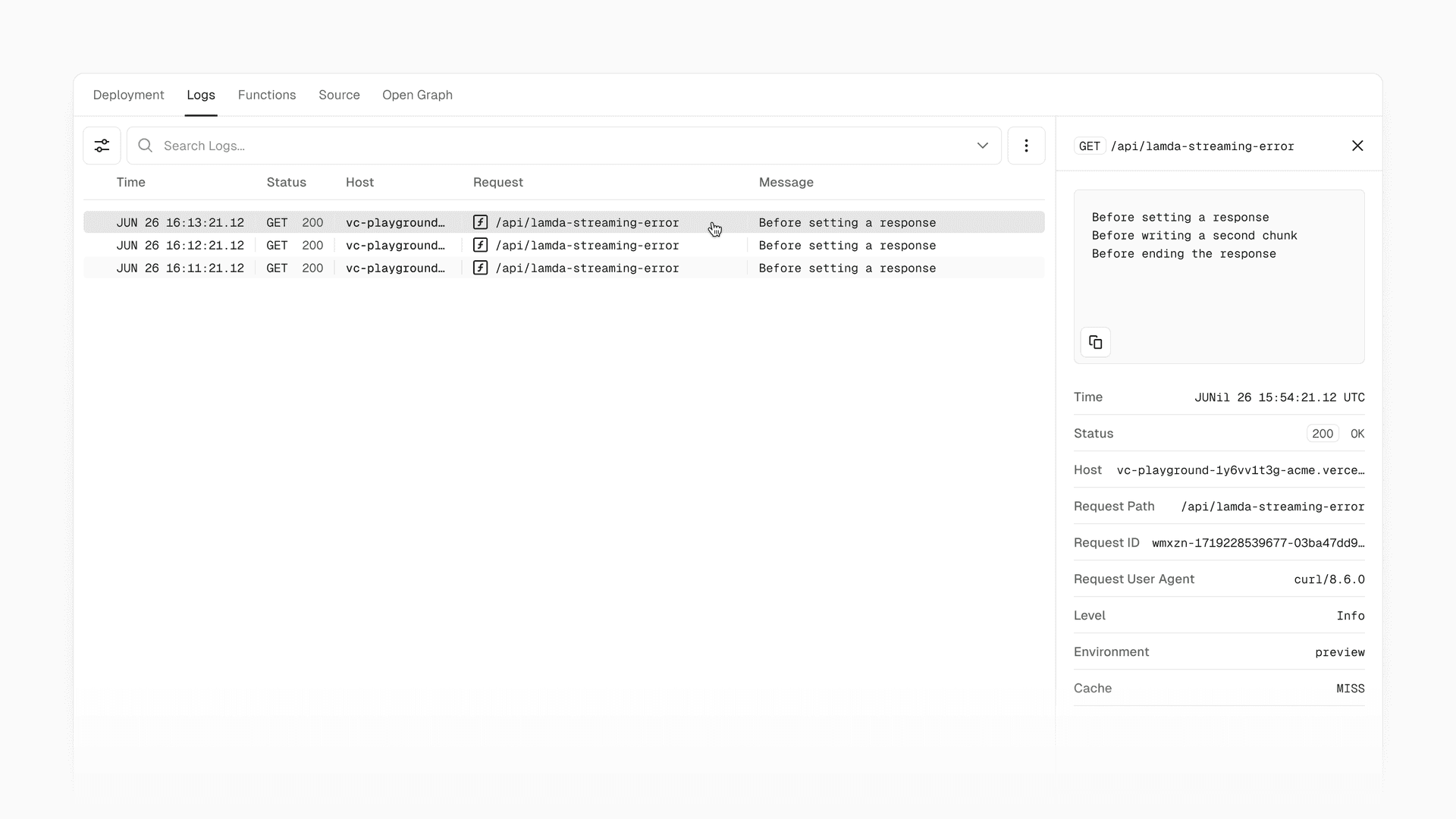 You will notice the individual log lines do not display the status code. This is because logs are independent of the response and can occur before a status code is determined. With streaming being enabled by default, this brings consistency to the logs experience when using Vercel Functions.