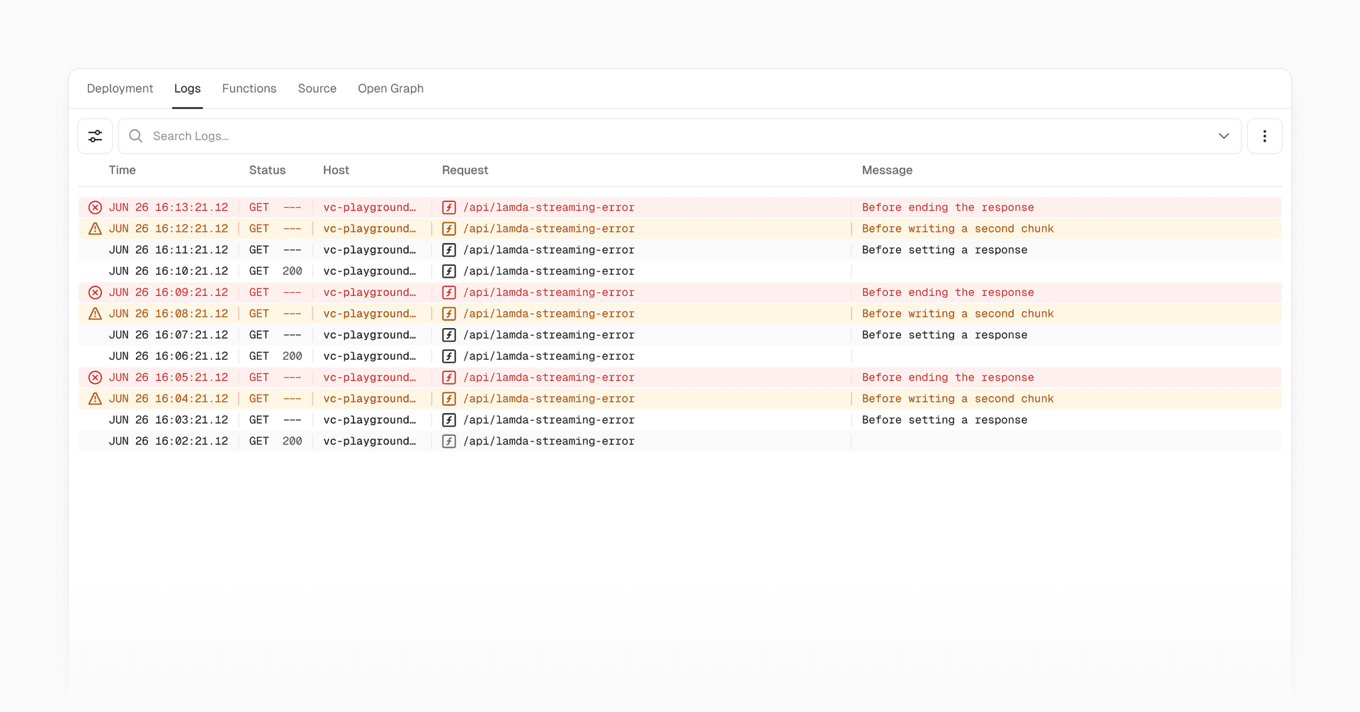 When streaming, response headers are sent immediately with the initial stream. If there is a runtime error after the initial headers have been sent, the function closes the stream and logs an error to Vercel. For example: