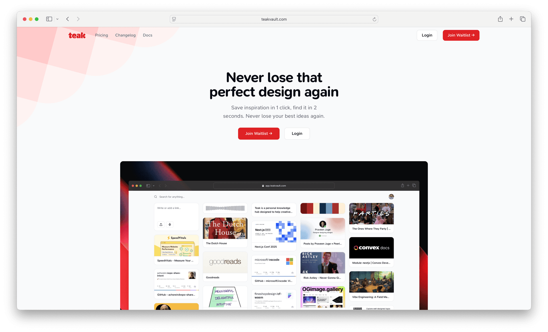 Teak is an open, privacy-friendly tool that lets designers capture and preserve visual inspiration before it disappears, built for creatives who care about how their ideas look and feel. It’s community-driven, easy to build on, and designed to support visual thinkers, designers, and developers in keeping their inspiration alive.
