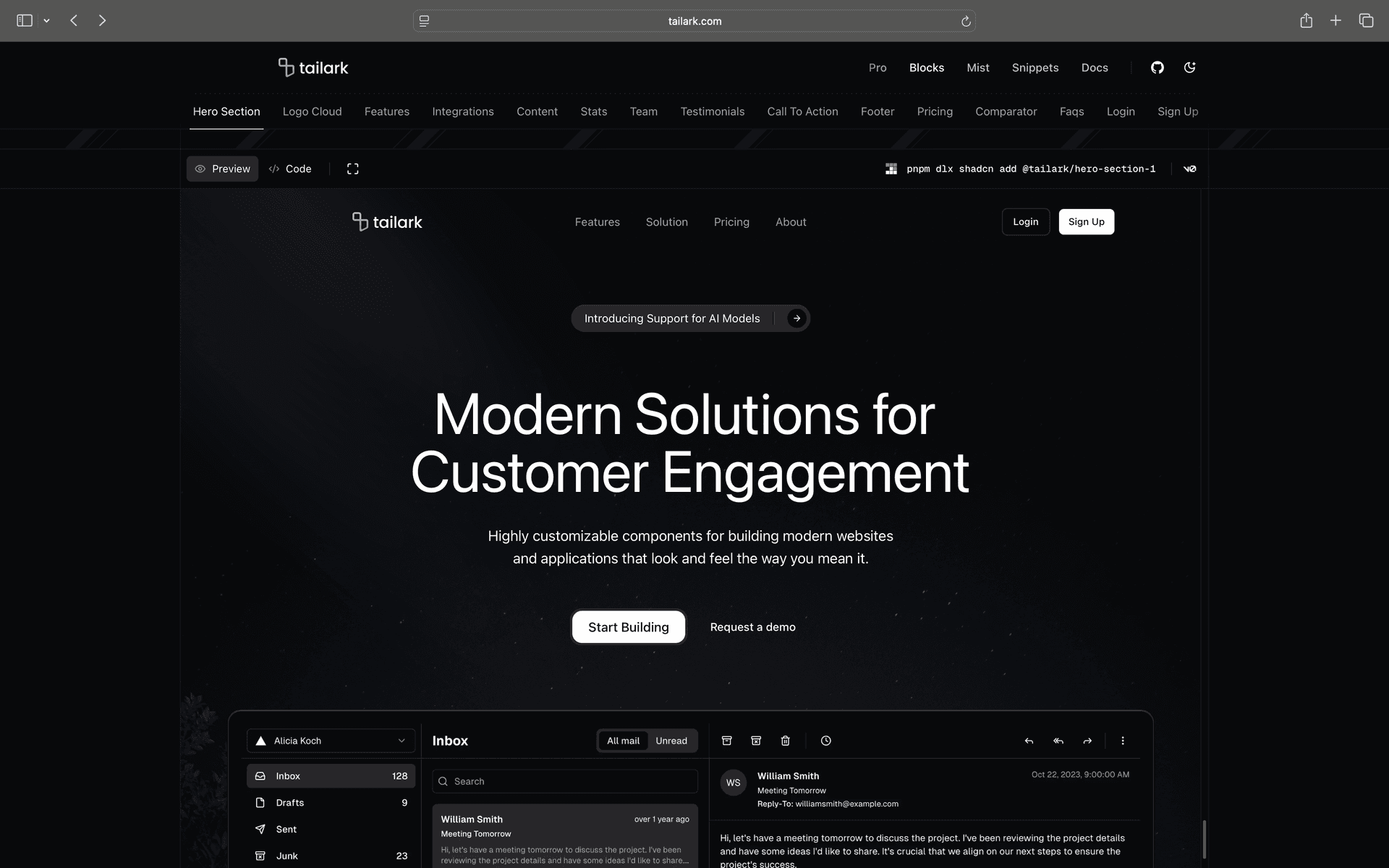 Tailark is a collection of 300+ modern marketing block kits built on top of shadcn UI, offering three distinct visual styles—from default shadcn to Notion-like and minimal—to help teams build polished websites fast. With 1.8K+ GitHub stars, 65,000+ users, and adoption from YC-backed startups, it stands out by being both developer-friendly and design-focused, providing flexible, high-quality blocks that don’t require heavy styling or rigid templates.