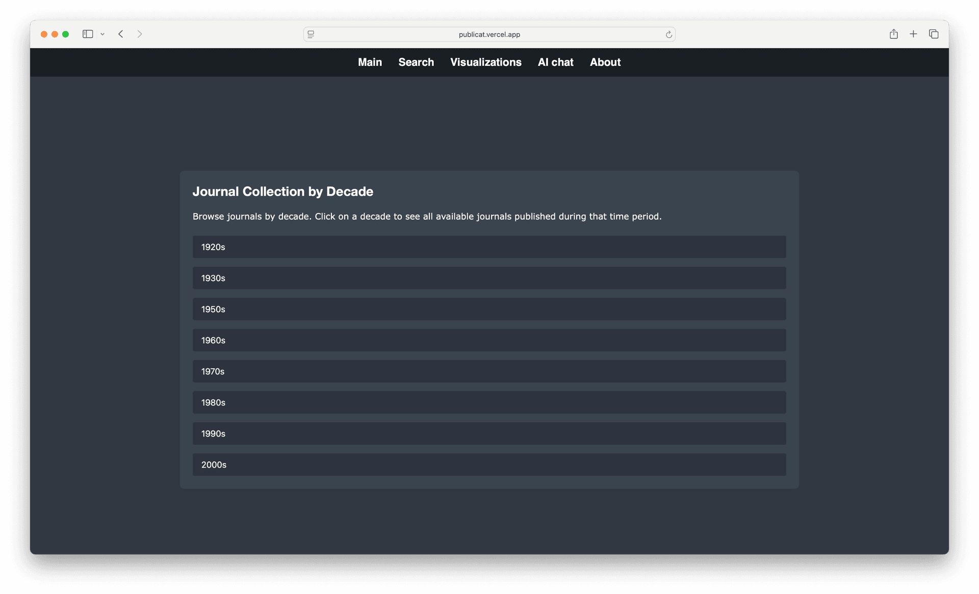 Publicat is a plug-and-play open-source tool that turns any CSV bibliography into an interactive journal explorer with timelines and visualizations, built specifically for humanities researchers without web-development resources. Featured in Stanford’s Open Source Project Registry and used by research groups across multiple countries, it brings accessible, humanities-focused digital tools to scholars who traditionally lack the technical or institutional support to publish their datasets online.