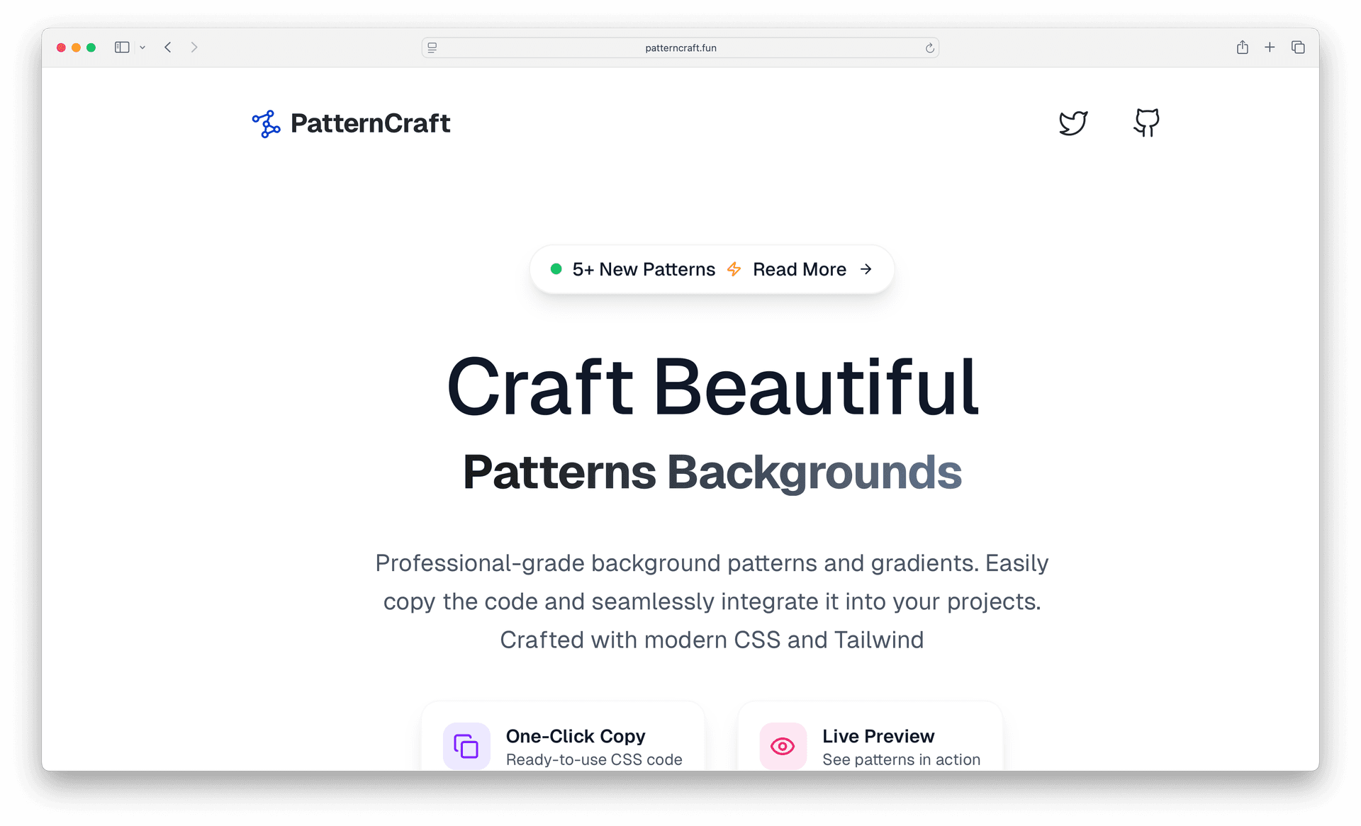 PatternCraft is an open-source library of pure-CSS and Tailwind background patterns that has grown into a popular inspiration hub for frontend developers. The project has 2.4K+ GitHub stars, 100K+ unique visitors, and 800–1K daily users exploring and sharing its lightweight, copy-paste patterns.