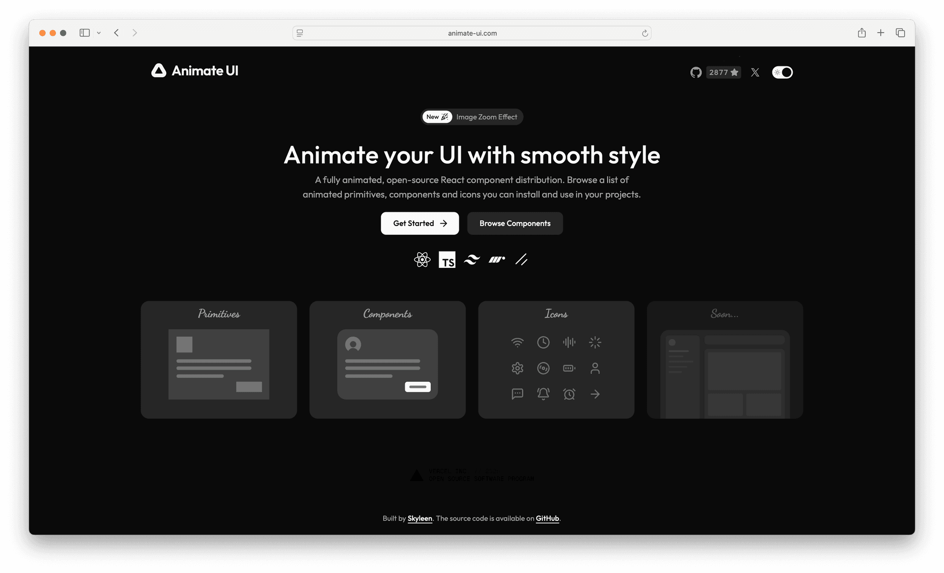 Animate UI is an open-source distribution of animated React components built with TailwindCSS and Motion, designed to bring modern, accessible animation to everyday UI. The project has grown to 2,600+ GitHub stars, 3,200+ X followers, millions of monthly edge requests on Vercel, and a thriving community contributing animated primitives, shadcn-style components, and 230+ animated Lucide icons.