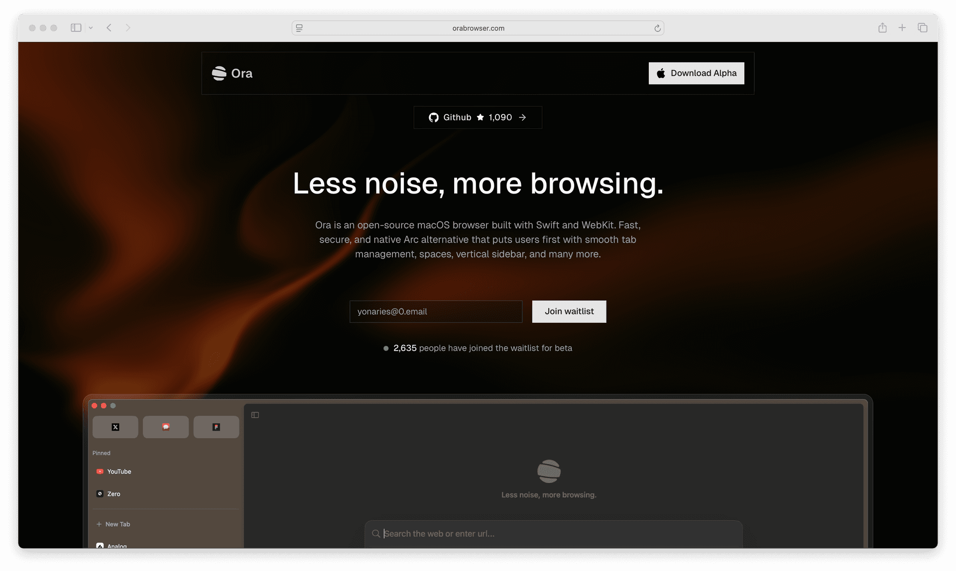 Ora is an open-source, Swift-built macOS browser aiming to deliver the Arc-style experience users want with native speed, isolation, and smooth tab management. Since launch, Ora has grown to 2,000+ Twitter followers, 960 GitHub stars, 19 contributors, and a 2,200-person waitlist.