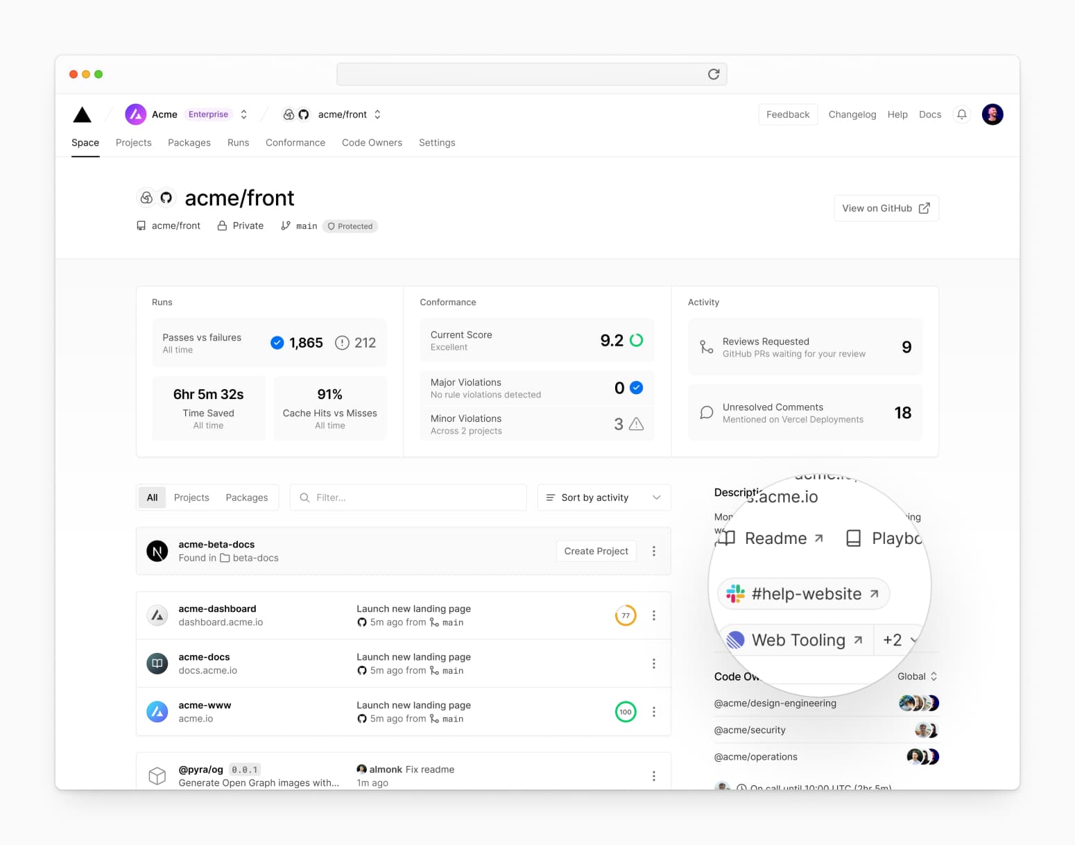 With Vercel Spaces, you'll find insights on your development workflows, code health and build logs, and brand new functionality to boost efficiency and remove blockers with Conformance, Code Owners, and Vercel Runs. These products, currently available in early private beta for Enterprises, can be used with Vercel regardless of where you host your application.