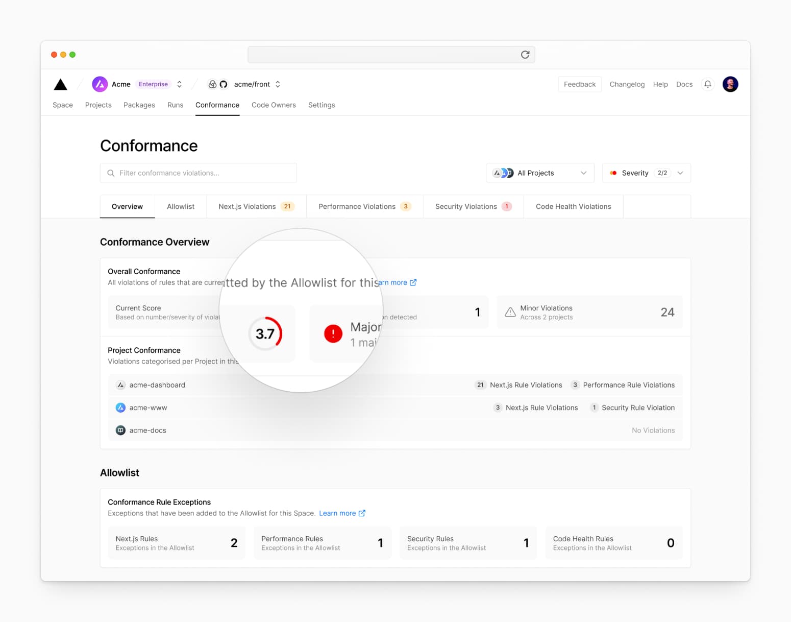 Maintaining frontend code quality is hard to do at scale. With Conformance, Vercel Spaces will automate detection of critical issues for your frontend products early in the development lifecycle and prevent them from ever reaching production.