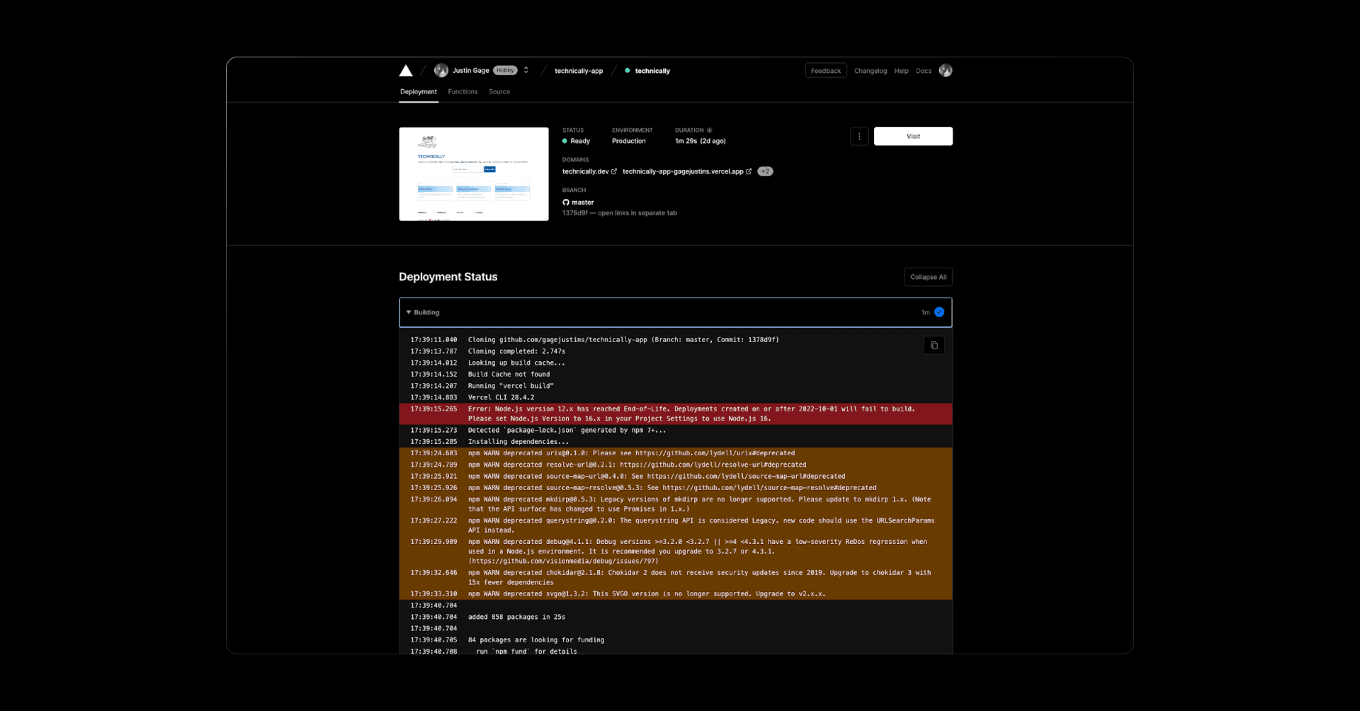 Finally, by default, Vercel assigns a random URL to your project so you can access it on the web right away. But you can easily add your own custom domains, like I’ve done here with technically.dev. Fun fact though, you can access an old version of the site at https://technically-app.vercel.app/.
