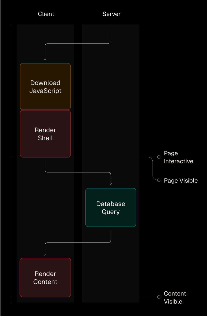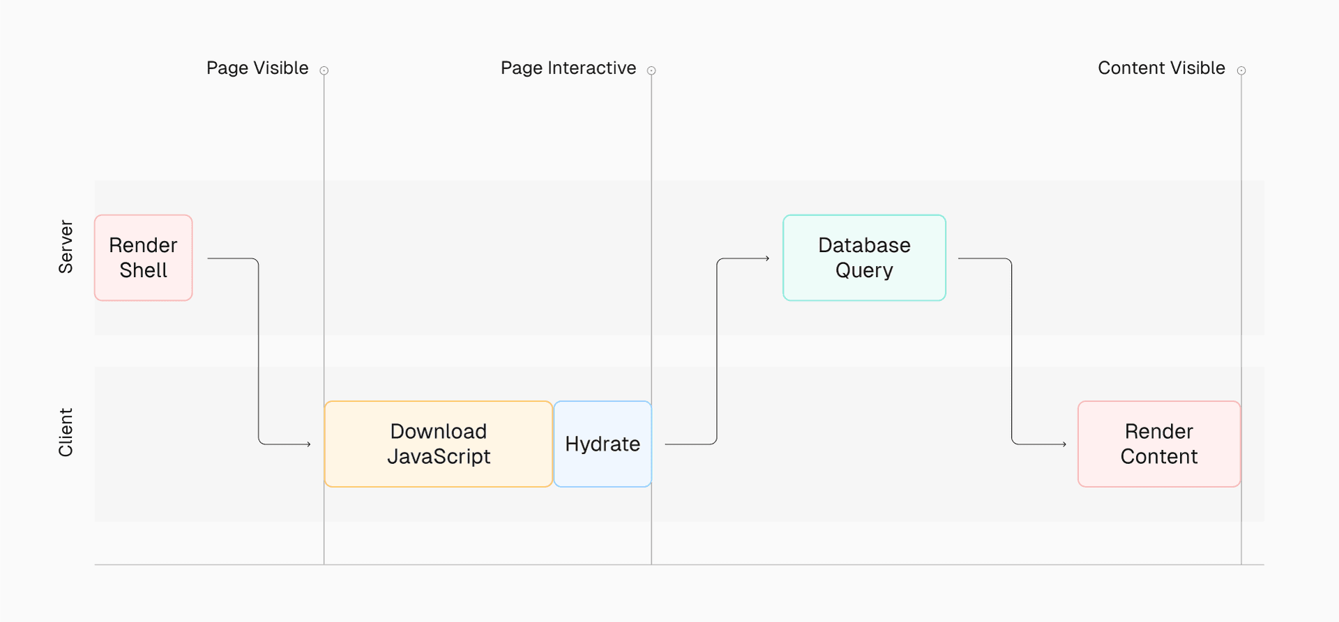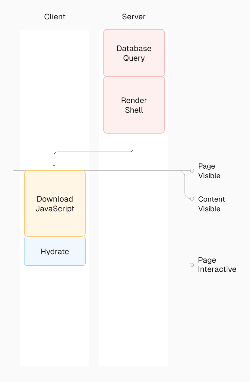 React improved with Server-Side Rendering (SSR), which moves the first render to the server. The HTML served to the user wasn’t empty anymore, and it improves how quickly the user saw the initial UI. However, the data still needs to be fetched to display actual content.