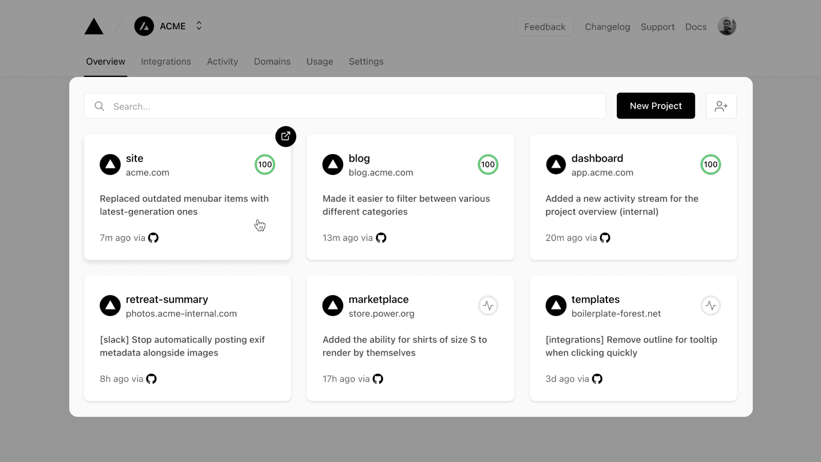 Your Vercel dashboard provides you with an overview of Projects available within your Personal Account or Team, and what their status is.