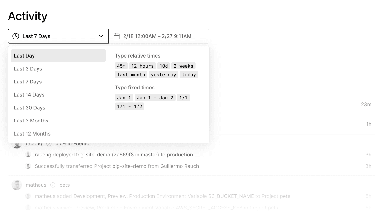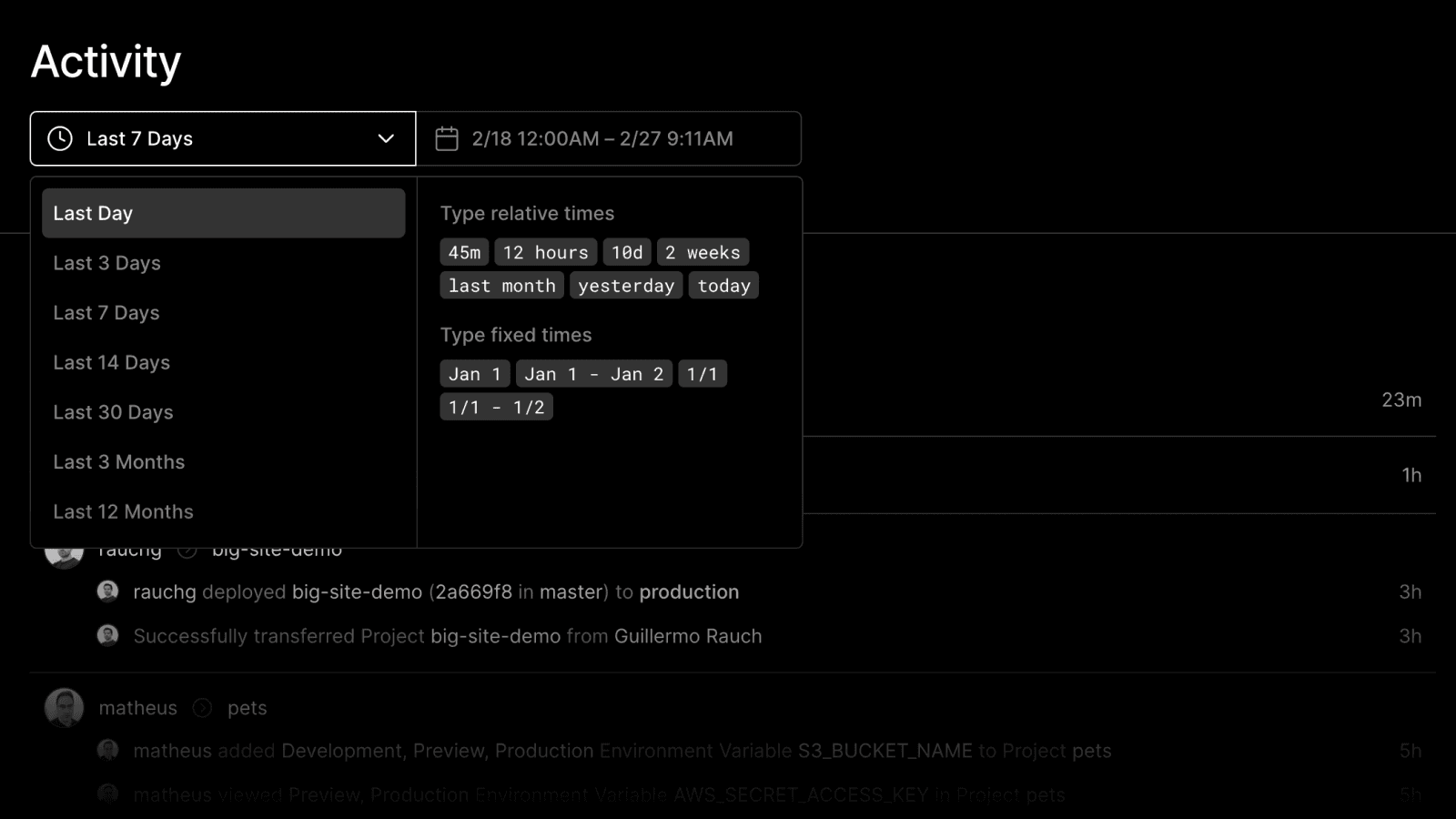 You are now able to filter the Activity of your team on Vercel based on a specific date. This makes it easier to find the actions your team has taken.