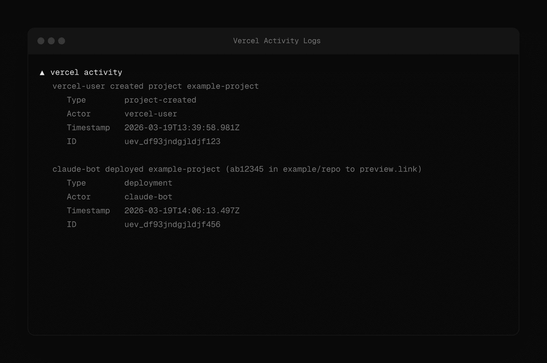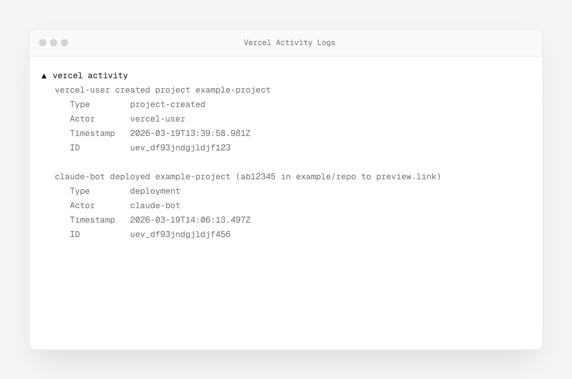 We've now added the vercel activity command to the CLI so that you can query for activity events. You can filter events by type, date range, and project, or view all events across your team.