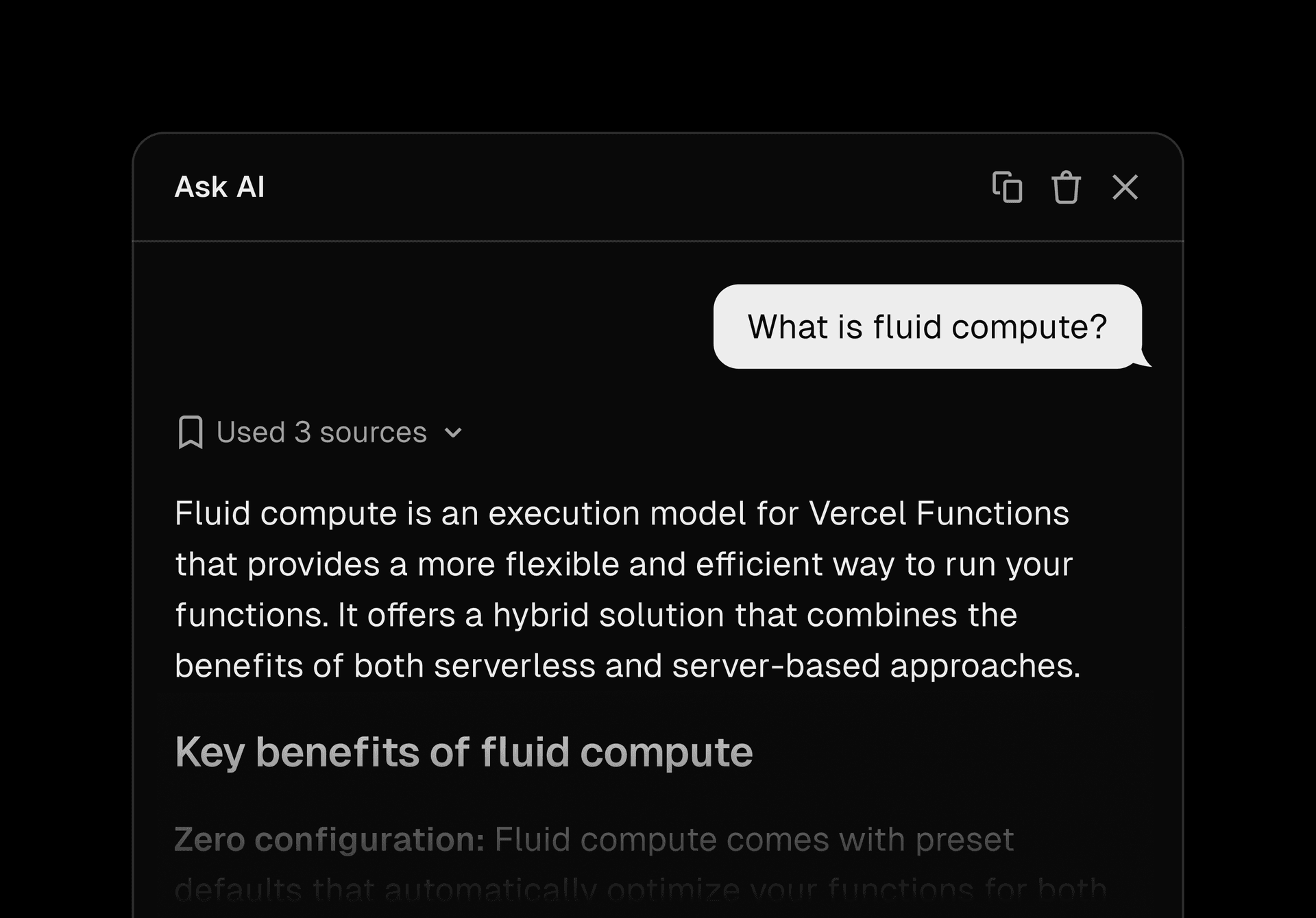 We're excited to announce that AI Chat is now live within the Vercel docs along with a subtle design overhaul. You can now get instant, conversational assistance directly on all docs pages.