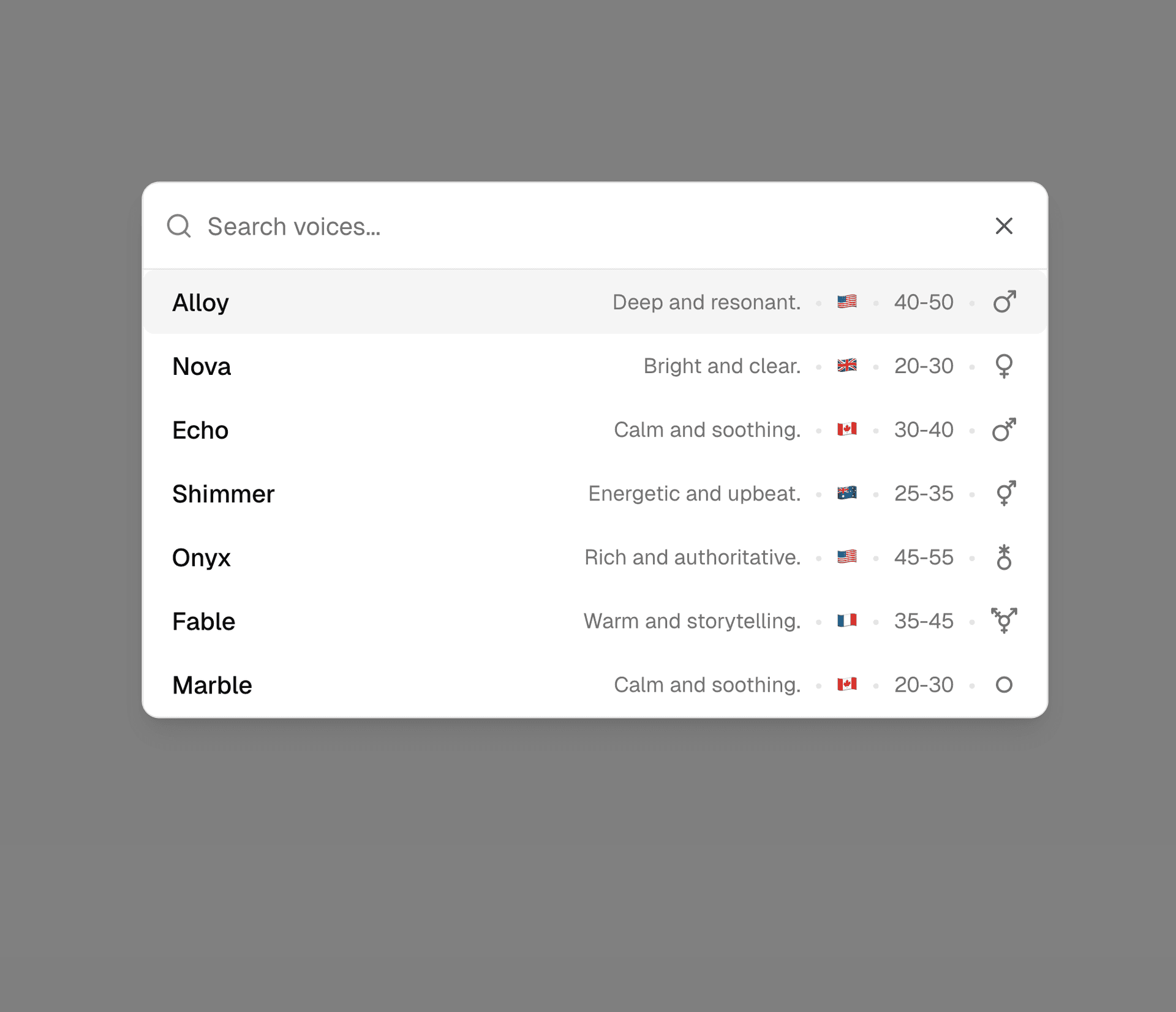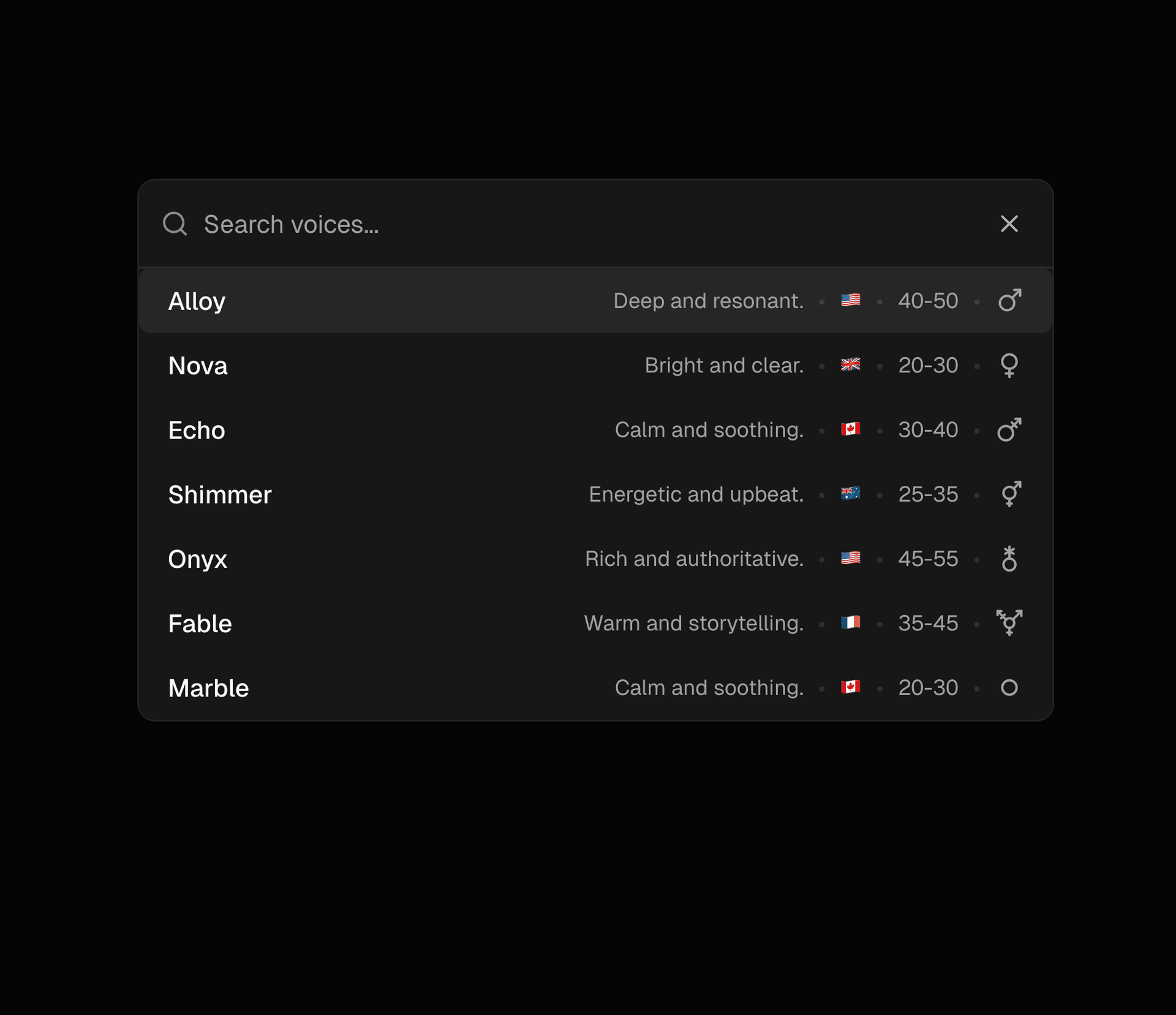 The VoiceSelector component provides a flexible and composable interface for selecting AI voices. Built on shadcn/ui's Dialog and Command components, it features a searchable voice list with support for metadata display (gender, accent, age), grouping, and customizable layouts. The component includes a context provider for accessing voice selection state from any nested component.