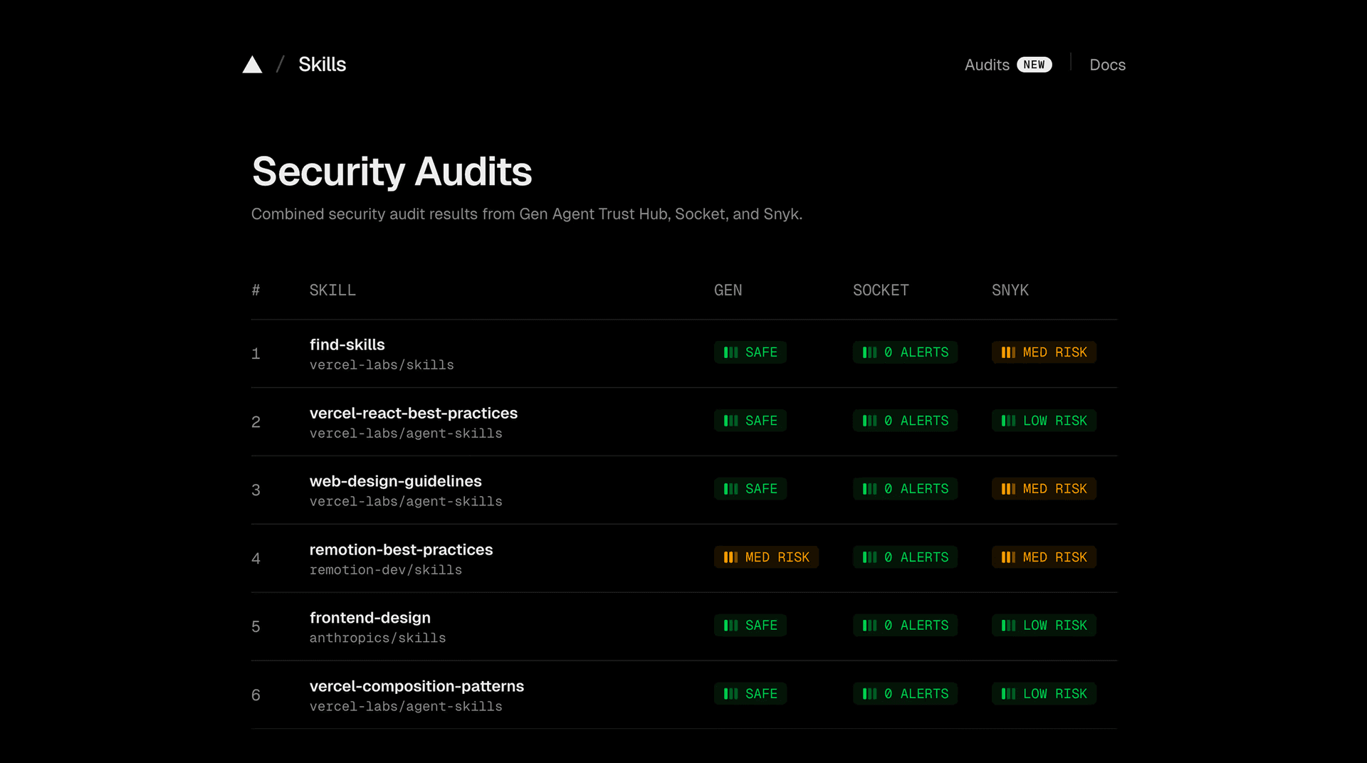 Working with our partners Gen, Socket, and Snyk, these independent security reports allow us to rapidly scale and audit over 60,000 skills and counting.